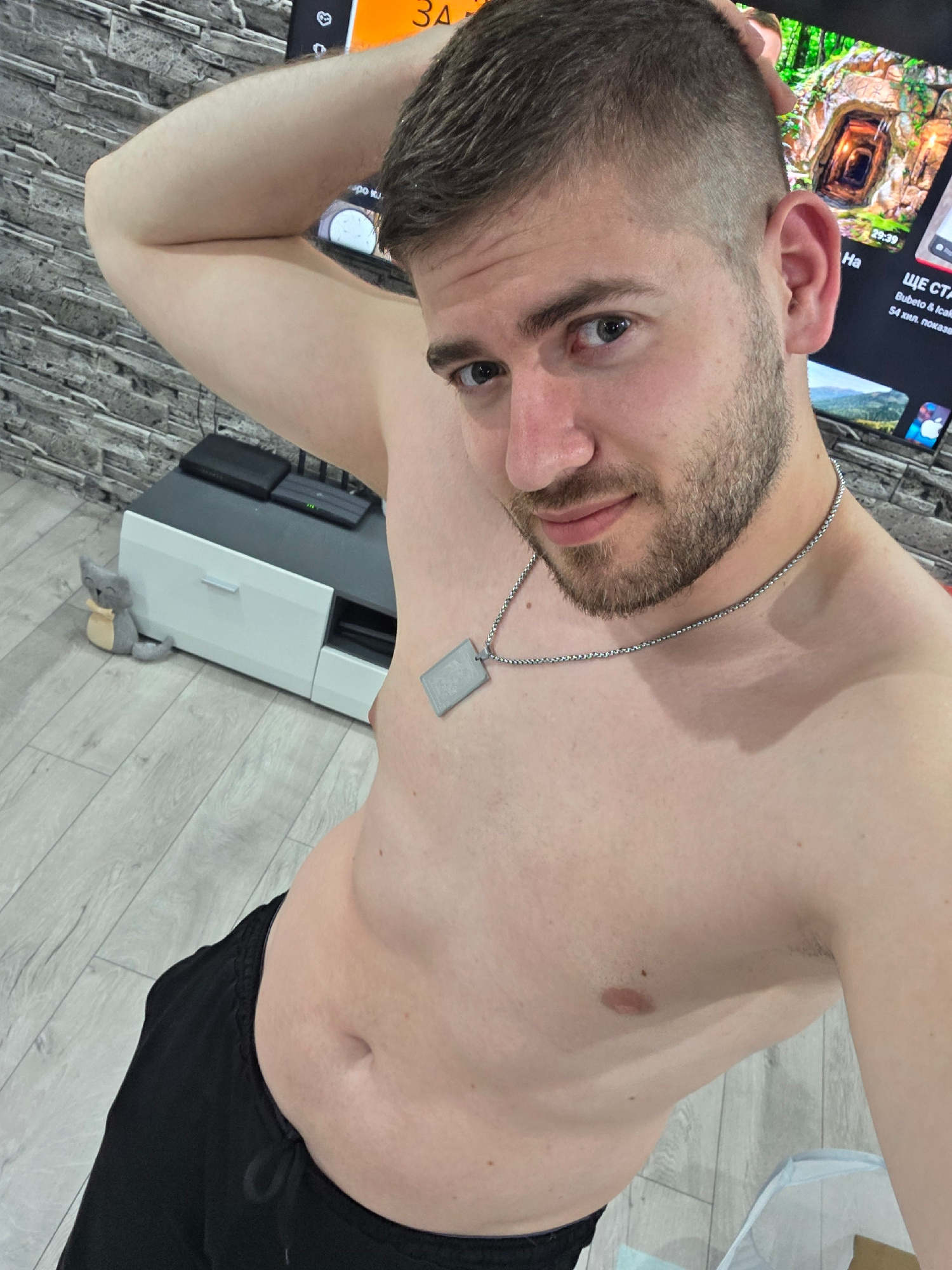 A torso of a shirtless man wearing black shorts and a silver dog tag necklace is shown. He has a beard and short brown hair. He is indoors, standing in front of a television and other furniture. The t…read more