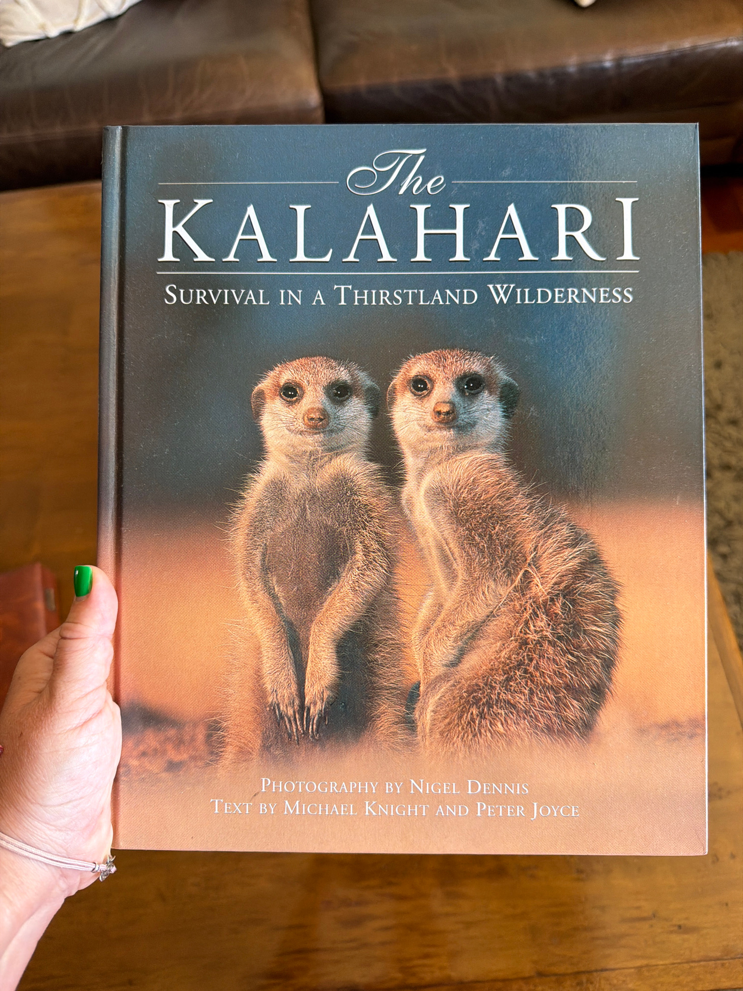 The image shows a book titled "The Kalahari: Survival in a Thirstland Wilderness," featuring two meerkats on the cover. The text "PHOTOGRAPHY BY NIGEL DENNIS," and "TEXT BY MICHAEL KNIGHT and Peter JO…read more
