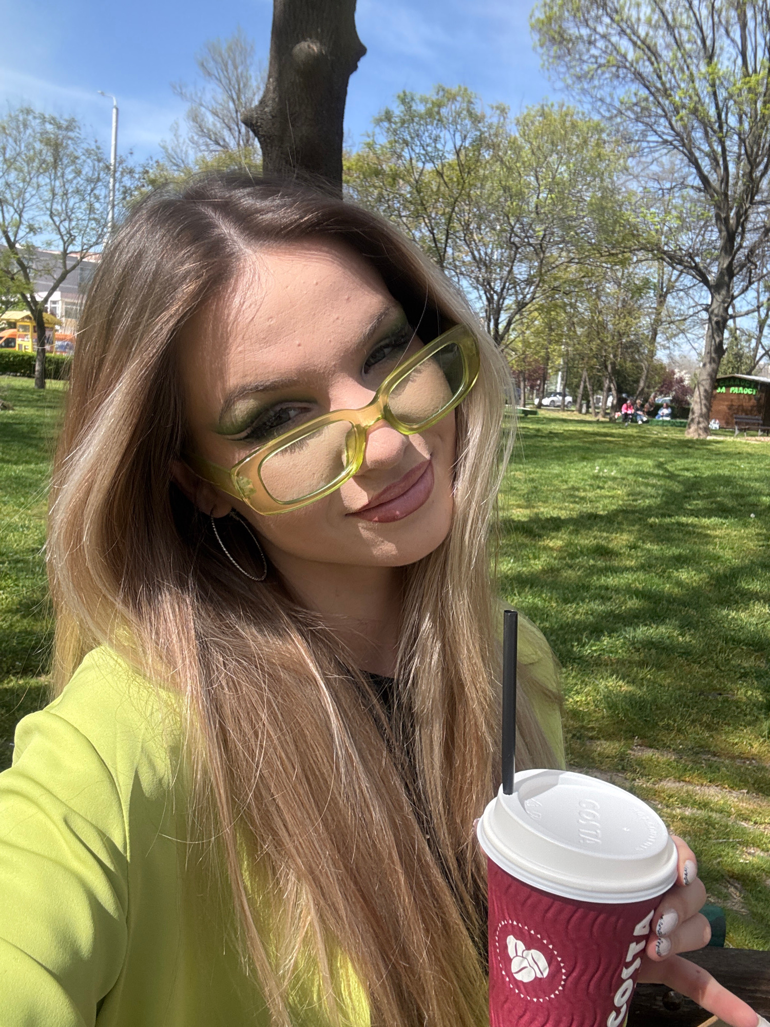A close-up, brightly lit outdoor portrait features a person with long, blonde hair, wearing clear or light yellow-framed glasses and a lime green top. The person's face is partially visible, showing g…read more