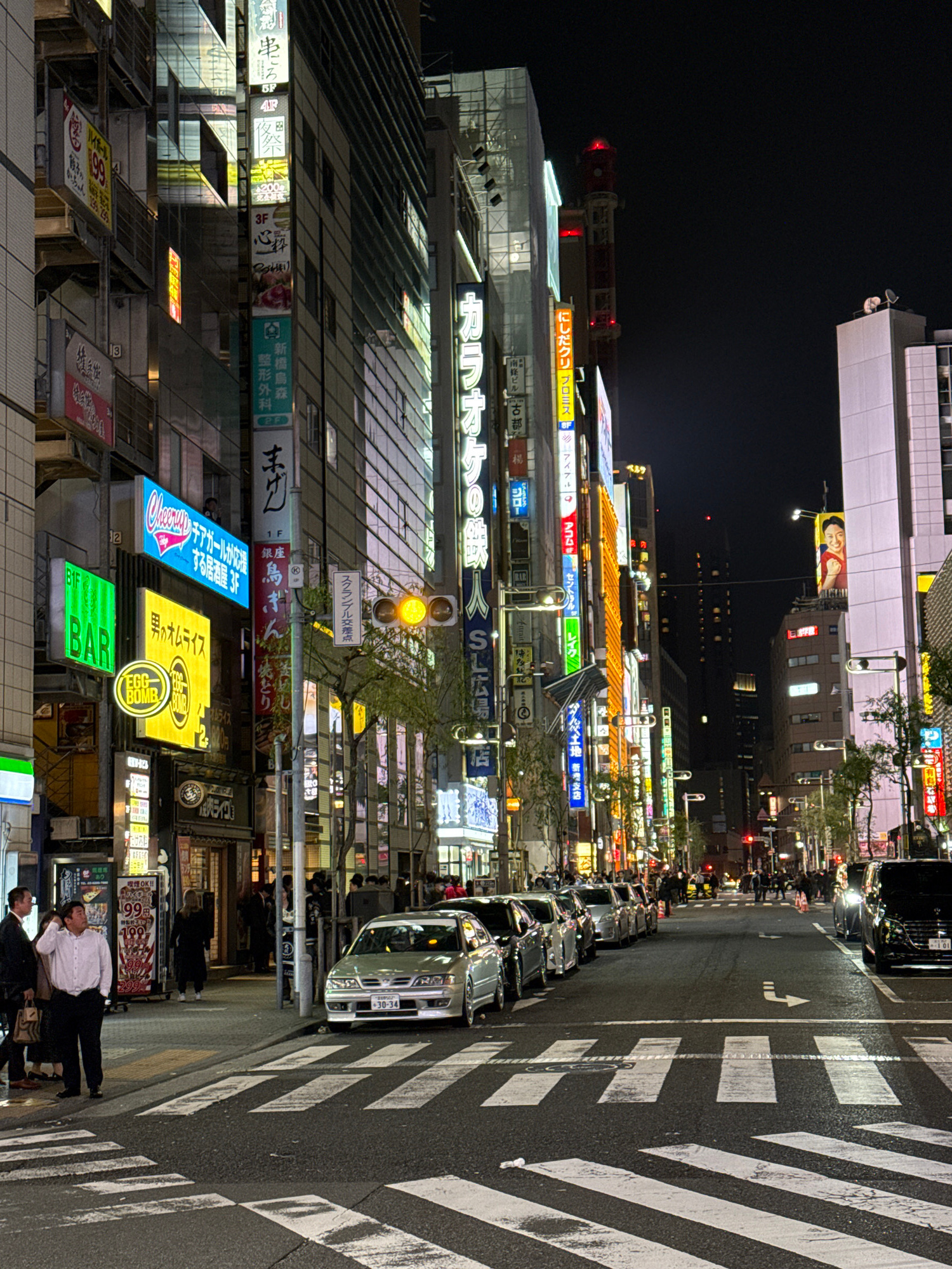 This media file captures a vibrant, vertically oriented nighttime street scene in an urban commercial district, strongly indicative of Japan, particularly Minato, as suggested by visible text. The per…read more