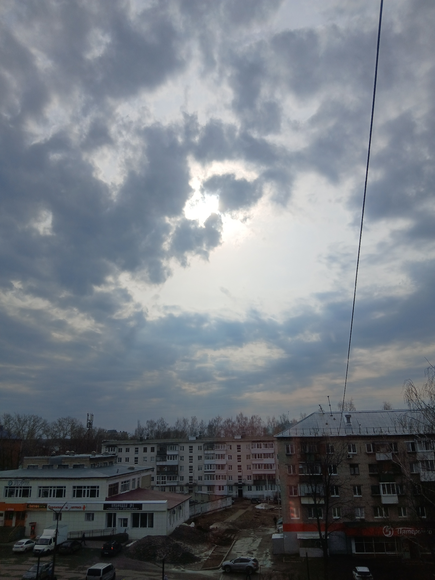 The image depicts a cityscape in Chaikovsky, Russia, under a cloudy sky with the sun obscured. The buildings are a mix of residential and commercial structures, varying in height and color. A prominen…read more