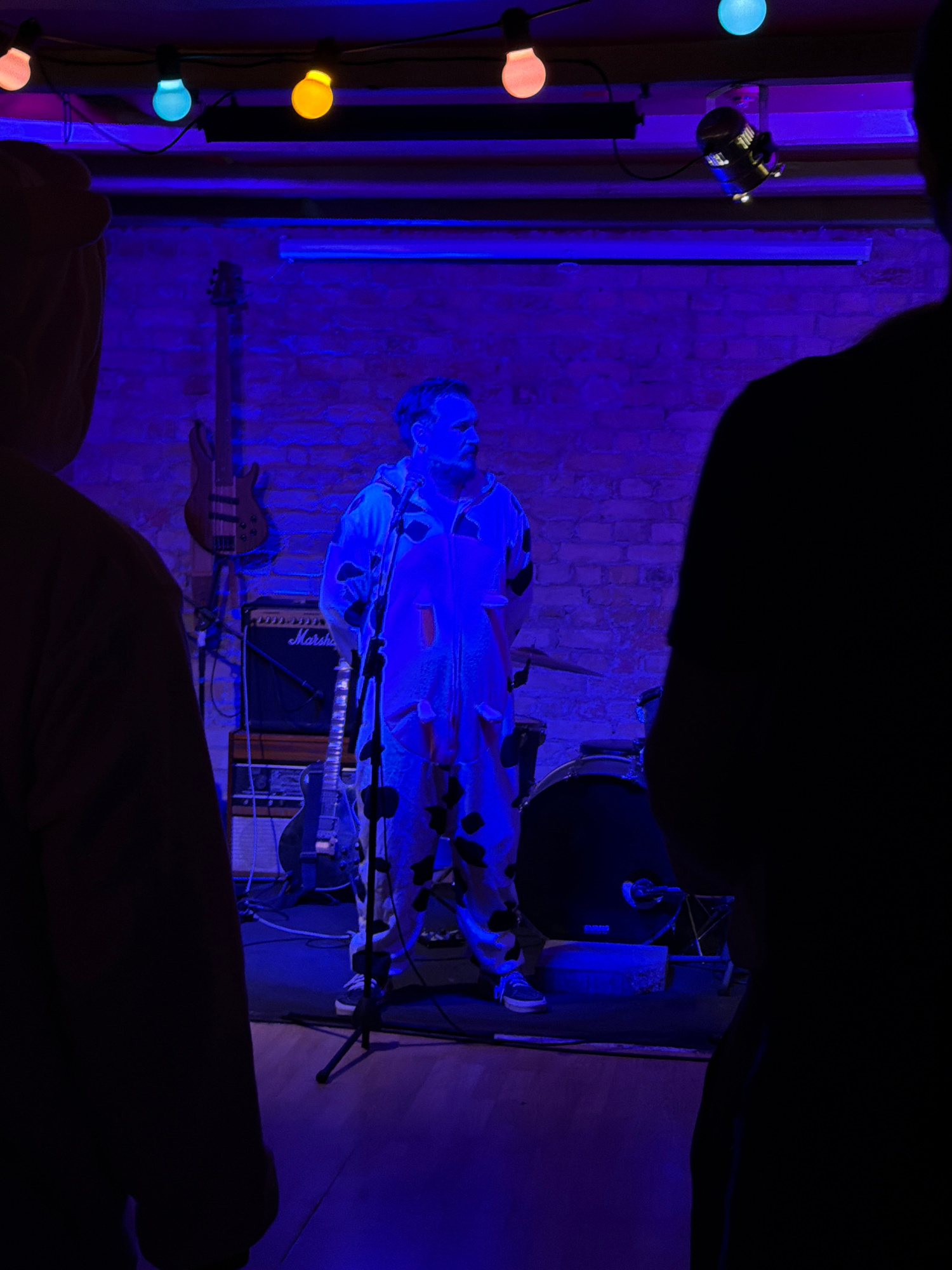 The image captures a live music performance or rehearsal indoors, likely at a venue in Riga, Latvia. The scene is bathed in intense blue and purple artificial lighting, creating a vibrant, stage-like…read more