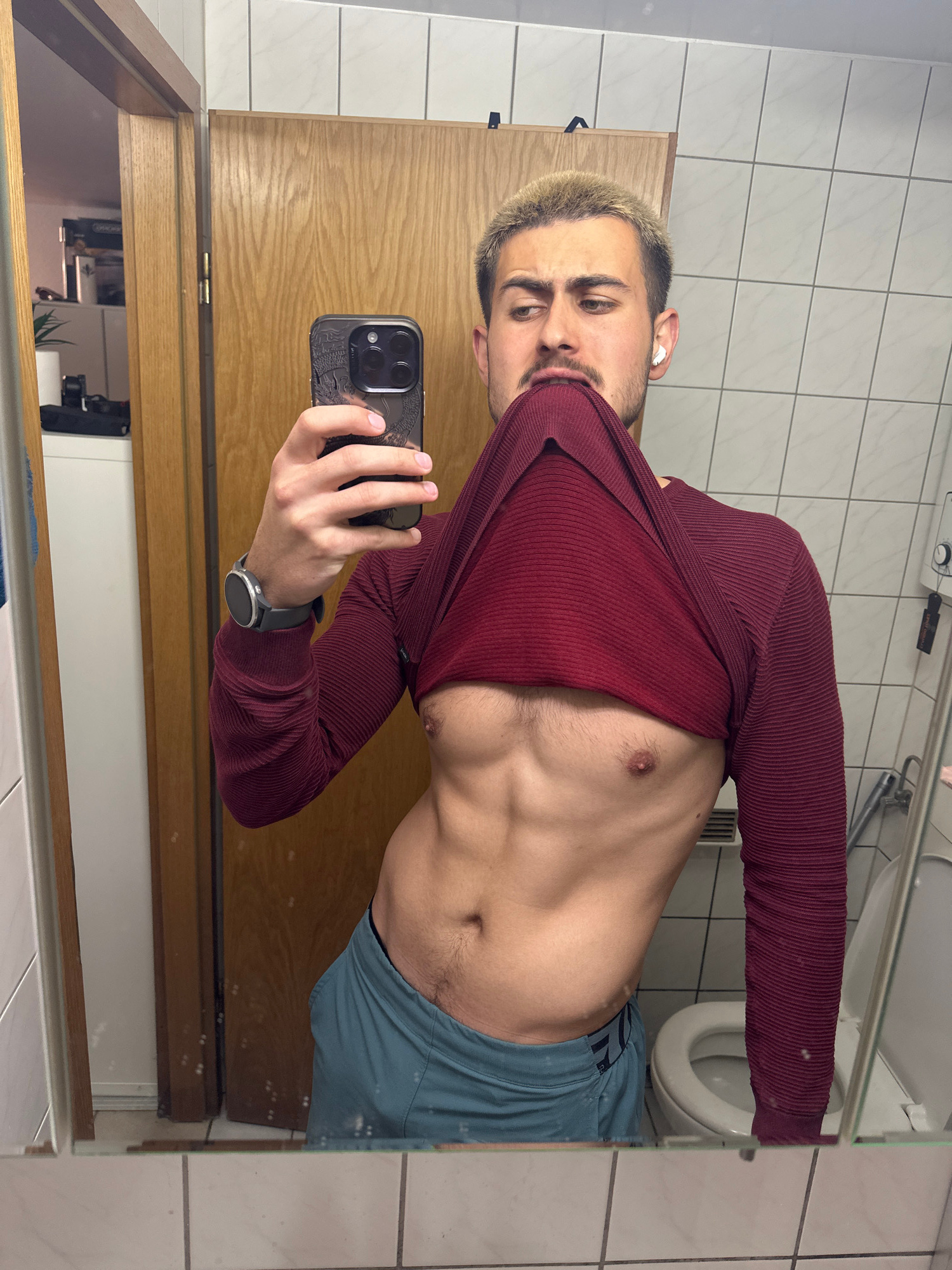 The image is a mirror selfie taken by a young man in what appears to be a bathroom. The man, with short, light brown/blonde hair and a short beard, is wearing a maroon/burgundy ribbed long-sleeved shi…read more