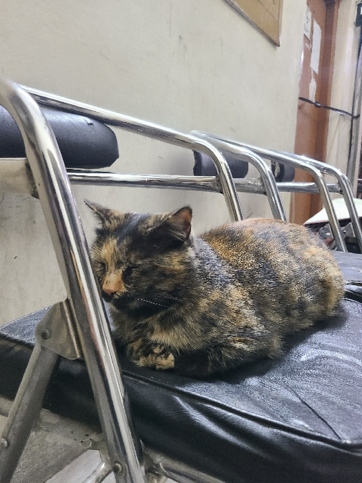 A tortoiseshell cat sleeps curled up on a black leather chair. The chair has a chrome frame and is partially visible. The cat is facing down, with its head resting on the front bar of the chair. Its f…read more