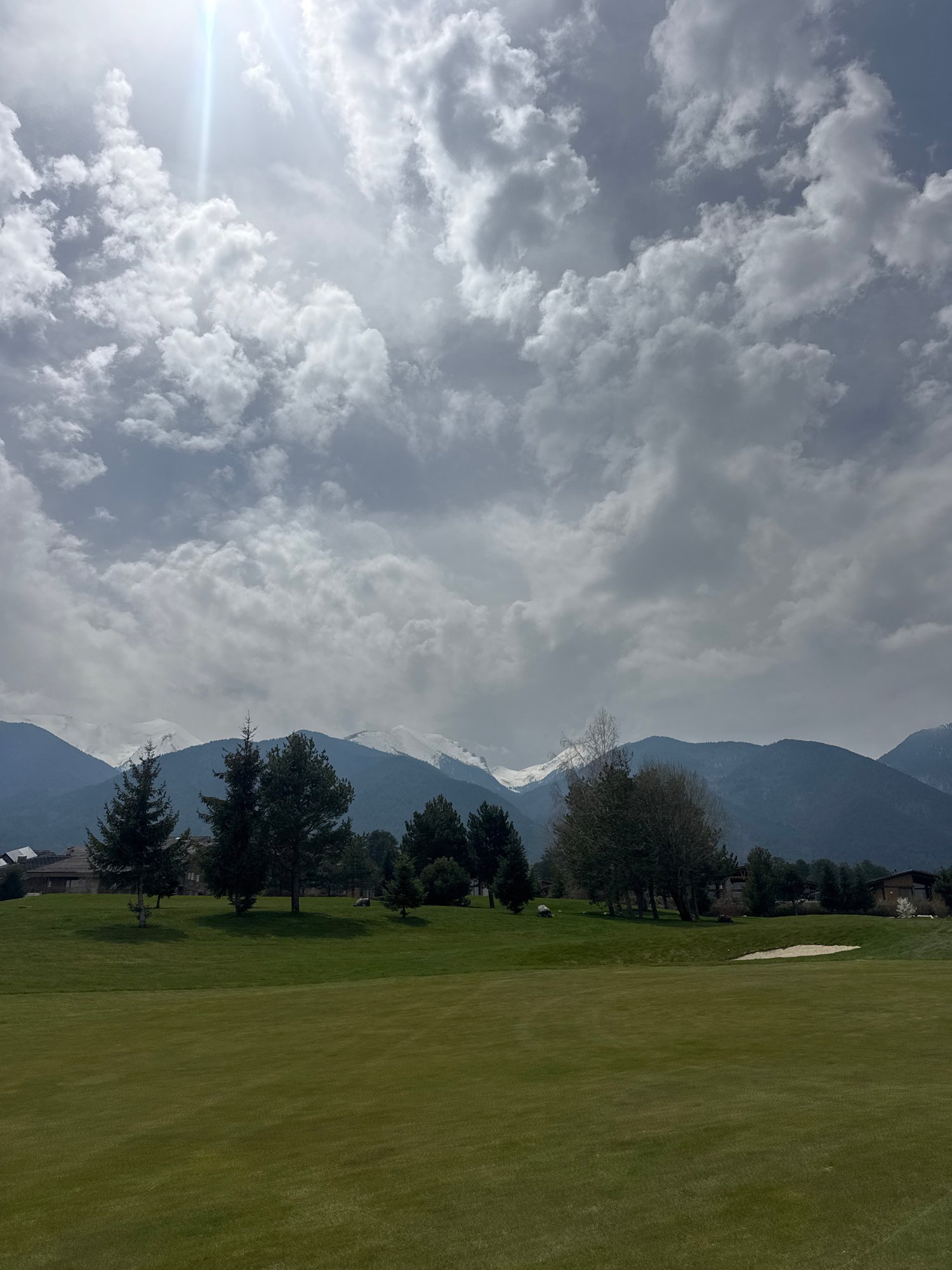 The image shows a view of a golf course in Bansko, Bulgaria. The foreground consists of a well-maintained green lawn. A line of trees separates the lawn from a distant mountain range that forms the ba…read more