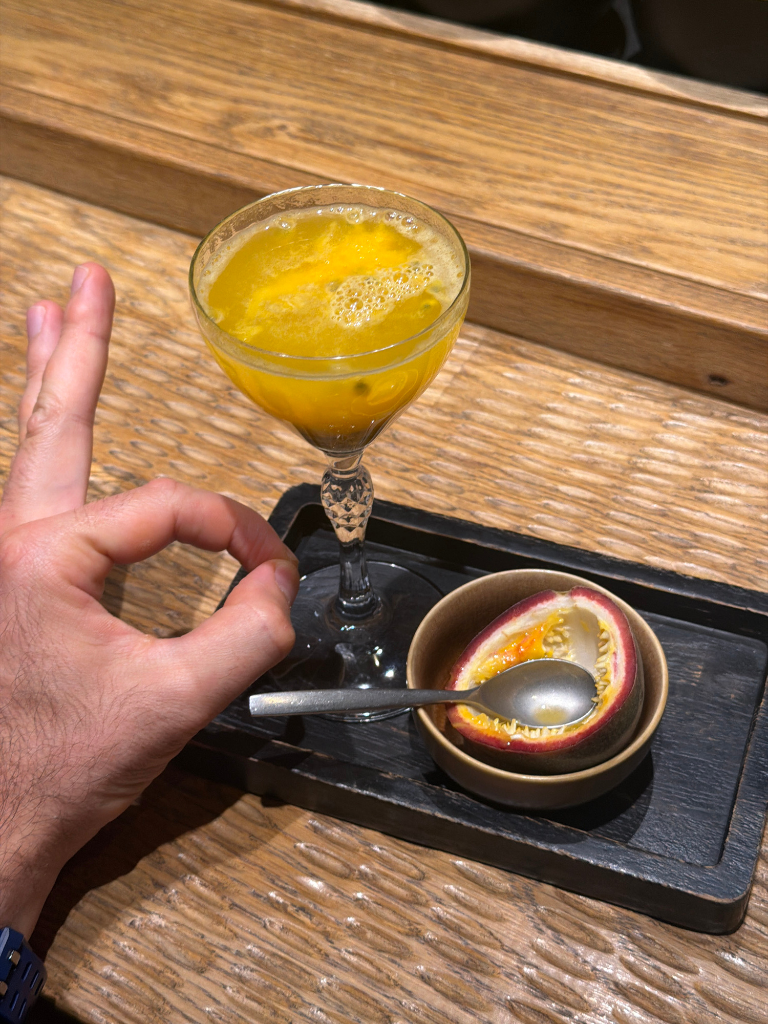 An overhead shot captures a hand reaching towards a stemmed glass filled with a vibrant yellow, frothy beverage, likely a juice or cocktail, against a backdrop of a wooden surface. The hand, exhibitinβ¦read more