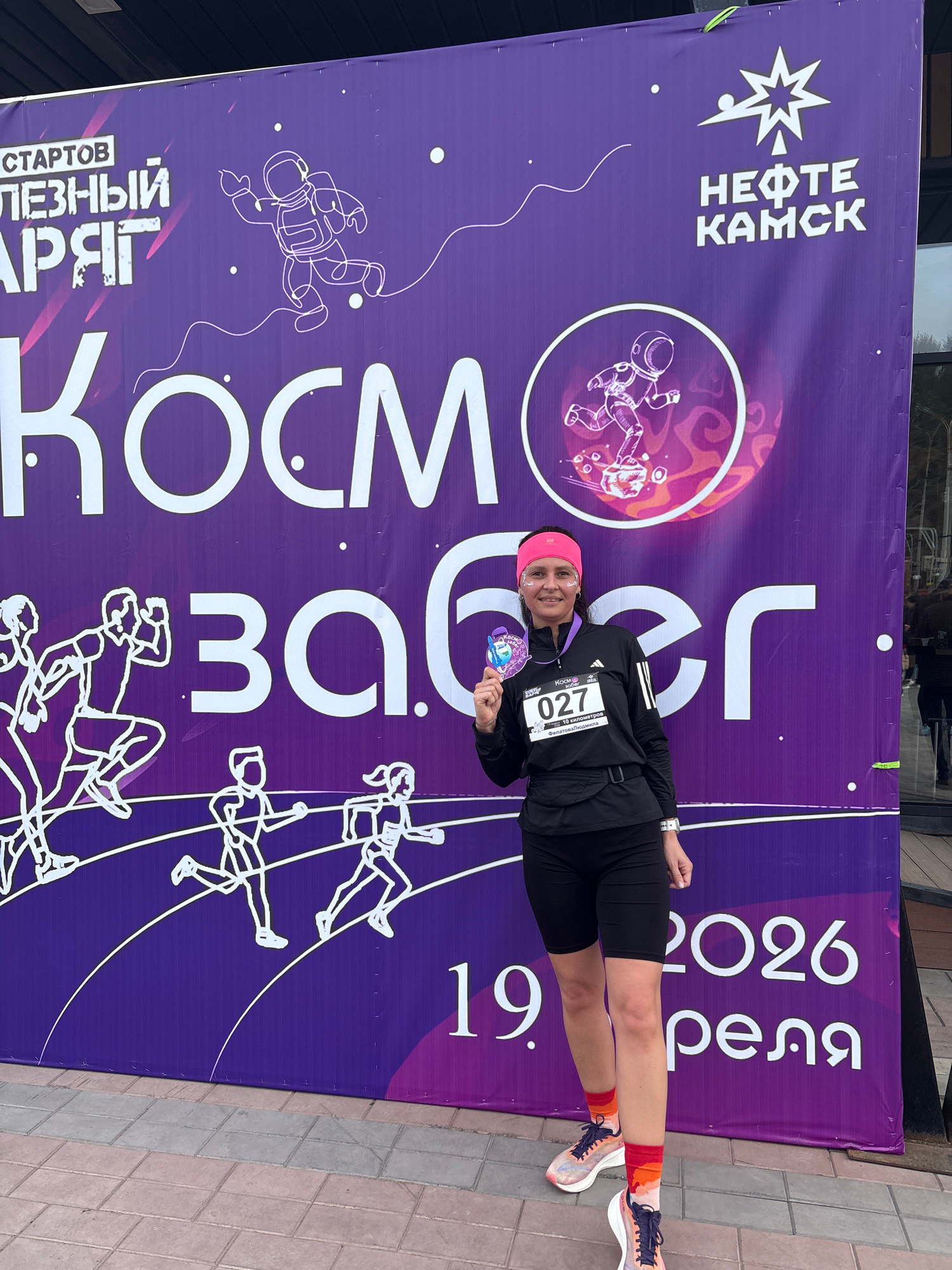 A woman stands smiling in front of a purple event banner. She is wearing a black Adidas jacket over athletic clothing and is holding up an event medal in her left hand. Her race number, 027, is pinned…read more