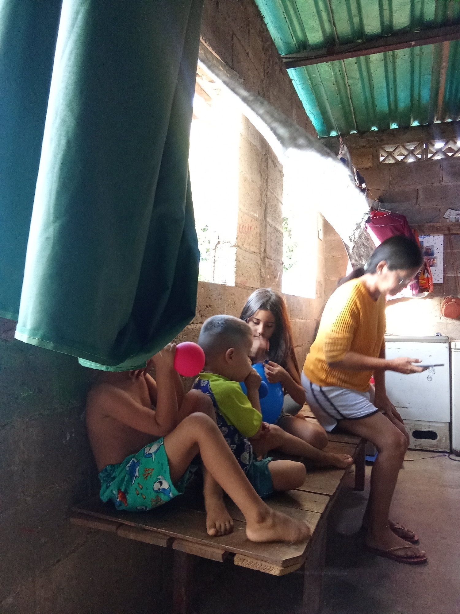 Four children are sitting on a wooden bench inside a dimly lit, sparsely furnished room. A large green curtain hangs to the left. A child on the left is blowing up a pink balloon. A child next to themβ¦read more