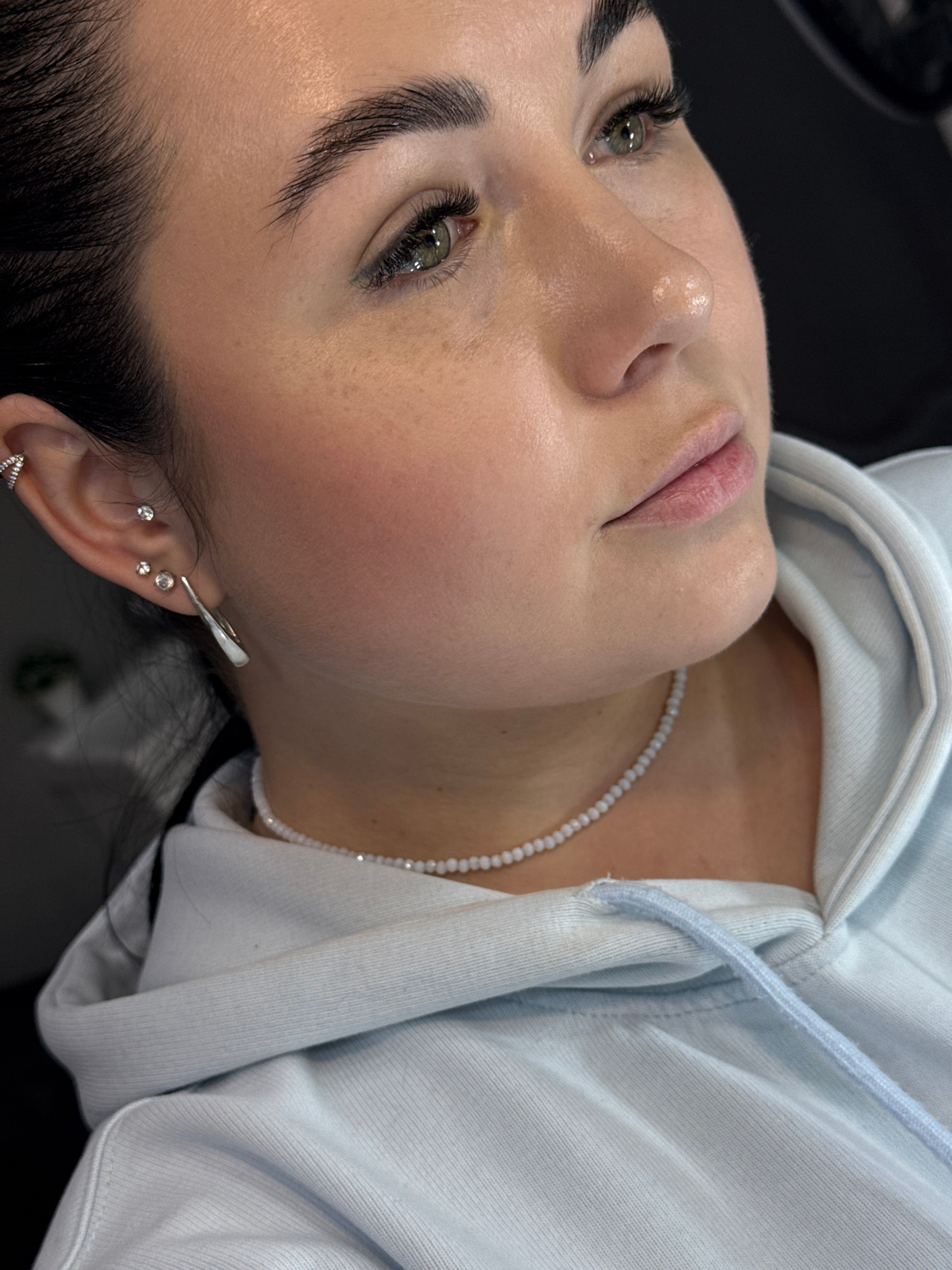 A close-up shot features a woman with dark hair and fair skin, wearing a light blue hoodie and a white beaded necklace. She has green eyes and prominent eyebrows. Her ear is adorned with multiple earr…read more