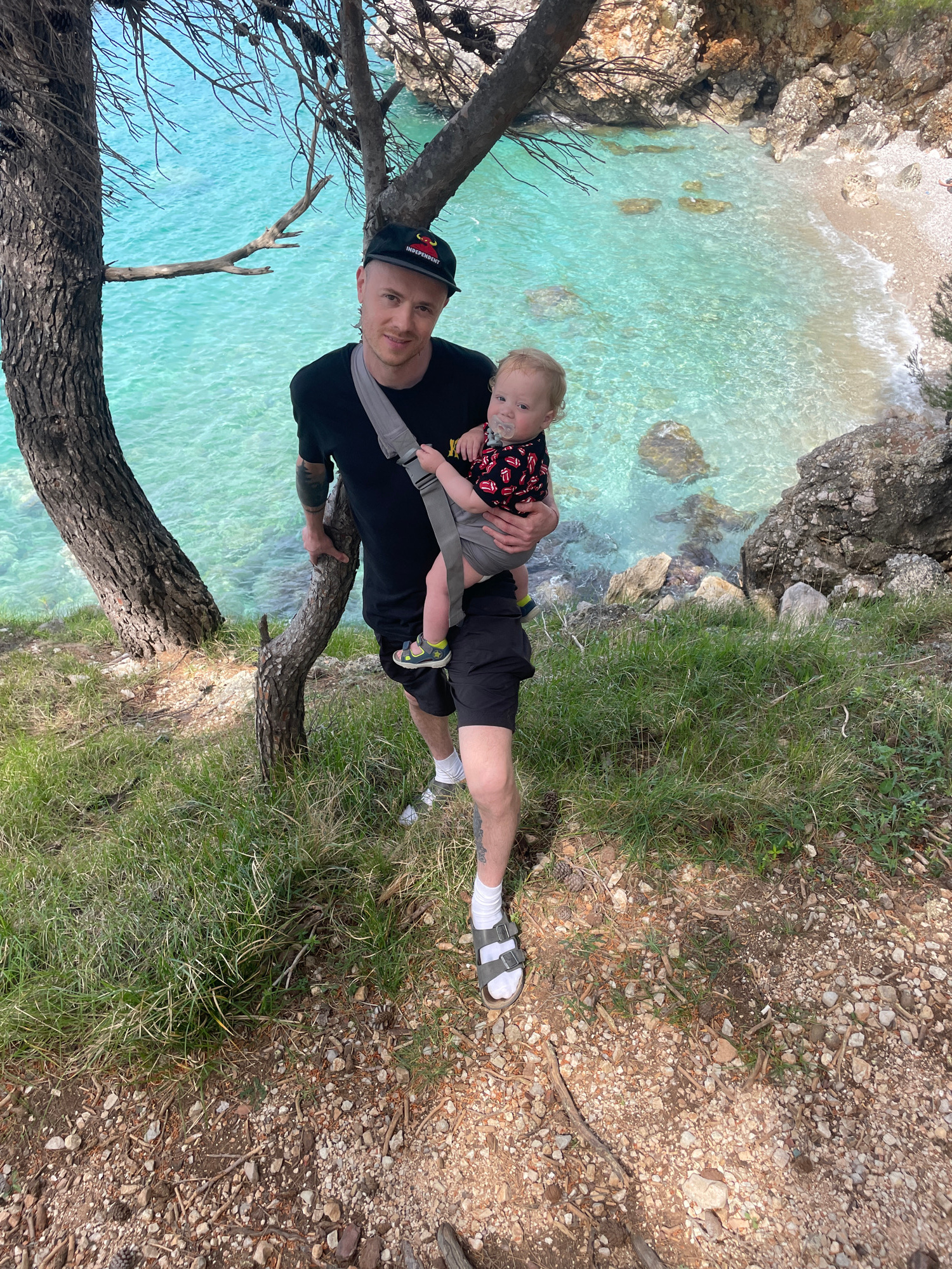 The image displays a man holding a young child in a baby carrier, situated on an elevated coastal path overlooking a clear, turquoise sea. The original image is rotated 90 degrees counter-clockwise, sā¦read more