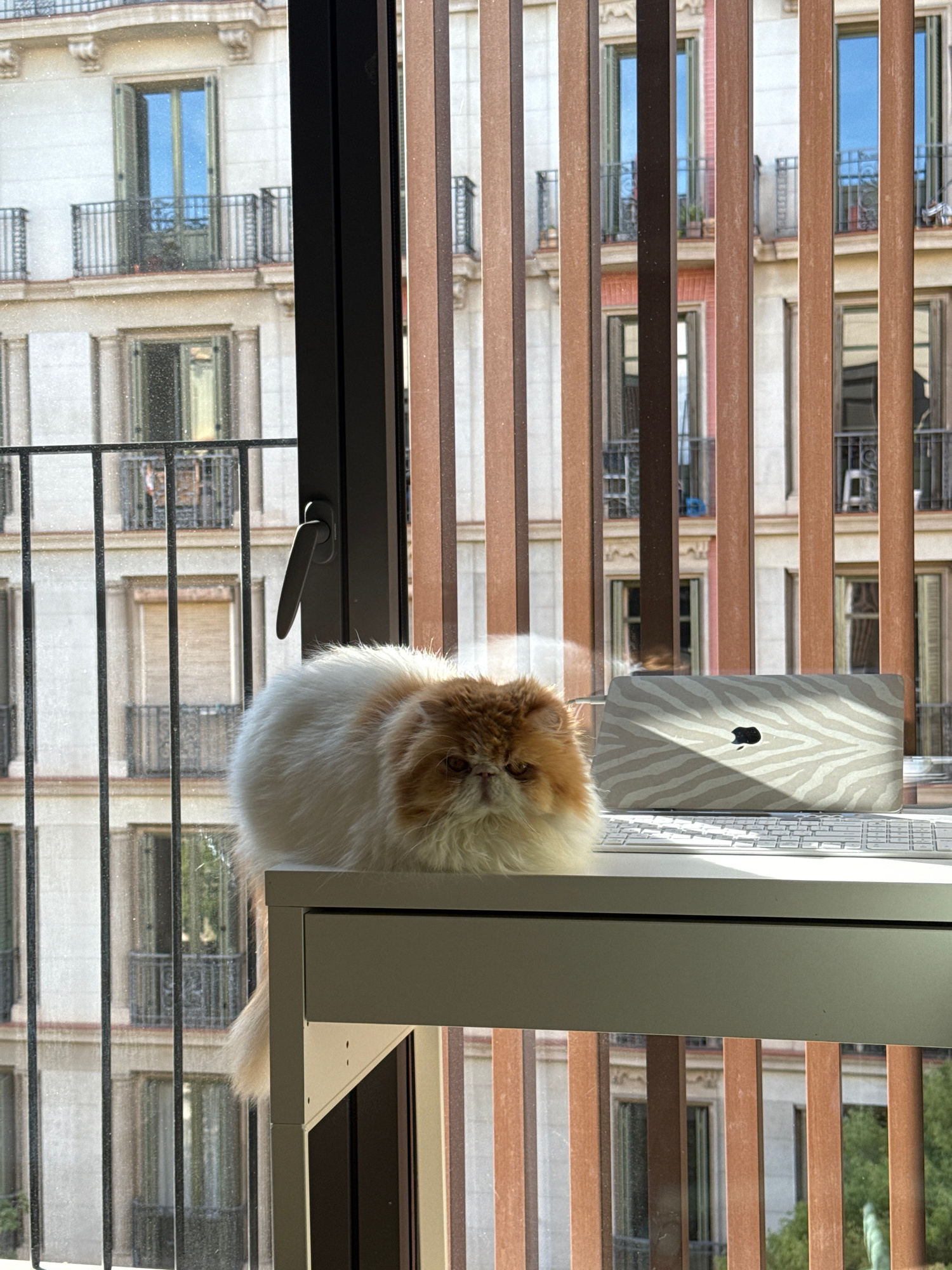 A medium shot of a cat on a windowsill with an open laptop in an apartment in Barcelona, Spain. The cat is a fluffy, white and orange Persian. The window has venetian blinds, and the view outside is o…read more