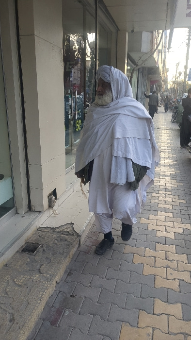 The image depicts a daytime street scene in Quetta City Tehsil, Pakistan. An elderly man is walking on a paved sidewalk, moving from left to right across the frame. He has a white beard and is dressed…read more