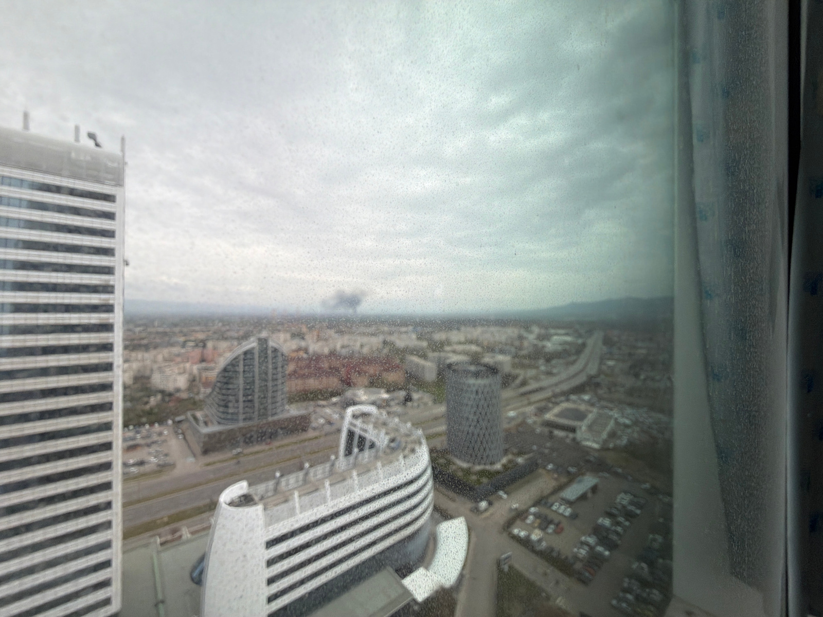 The image presents an aerial view of an urban landscape in Sofia, Bulgaria, observed through a window speckled with raindrops or condensation. The setting is a cloudy, overcast day, lending a muted an…read more