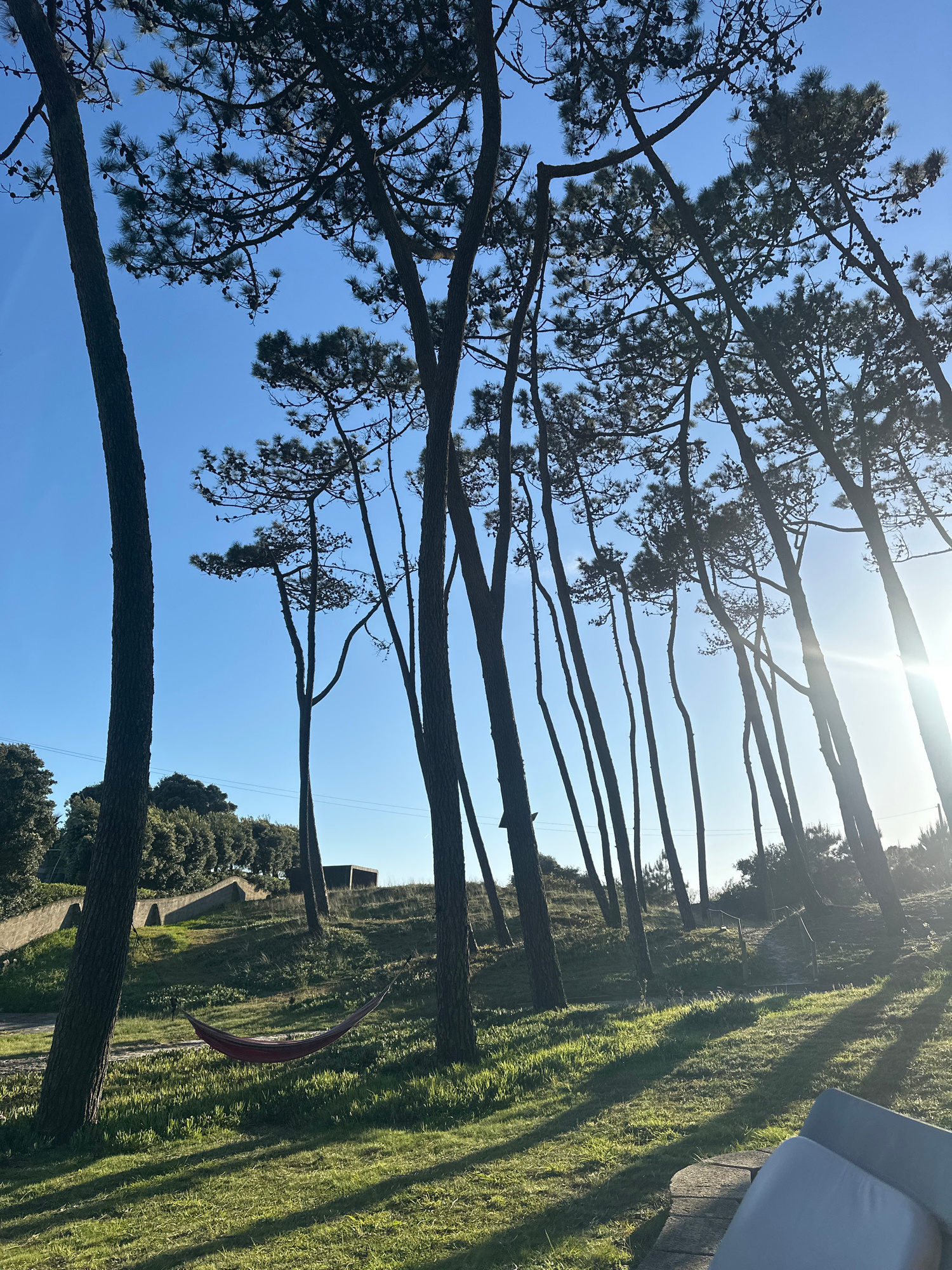 The image depicts a sunny day scene in Esposende, Portugal. A row of tall pine trees stretches across the frame, their trunks and branches dominating the foreground against a clear blue sky. Sunlight…read more