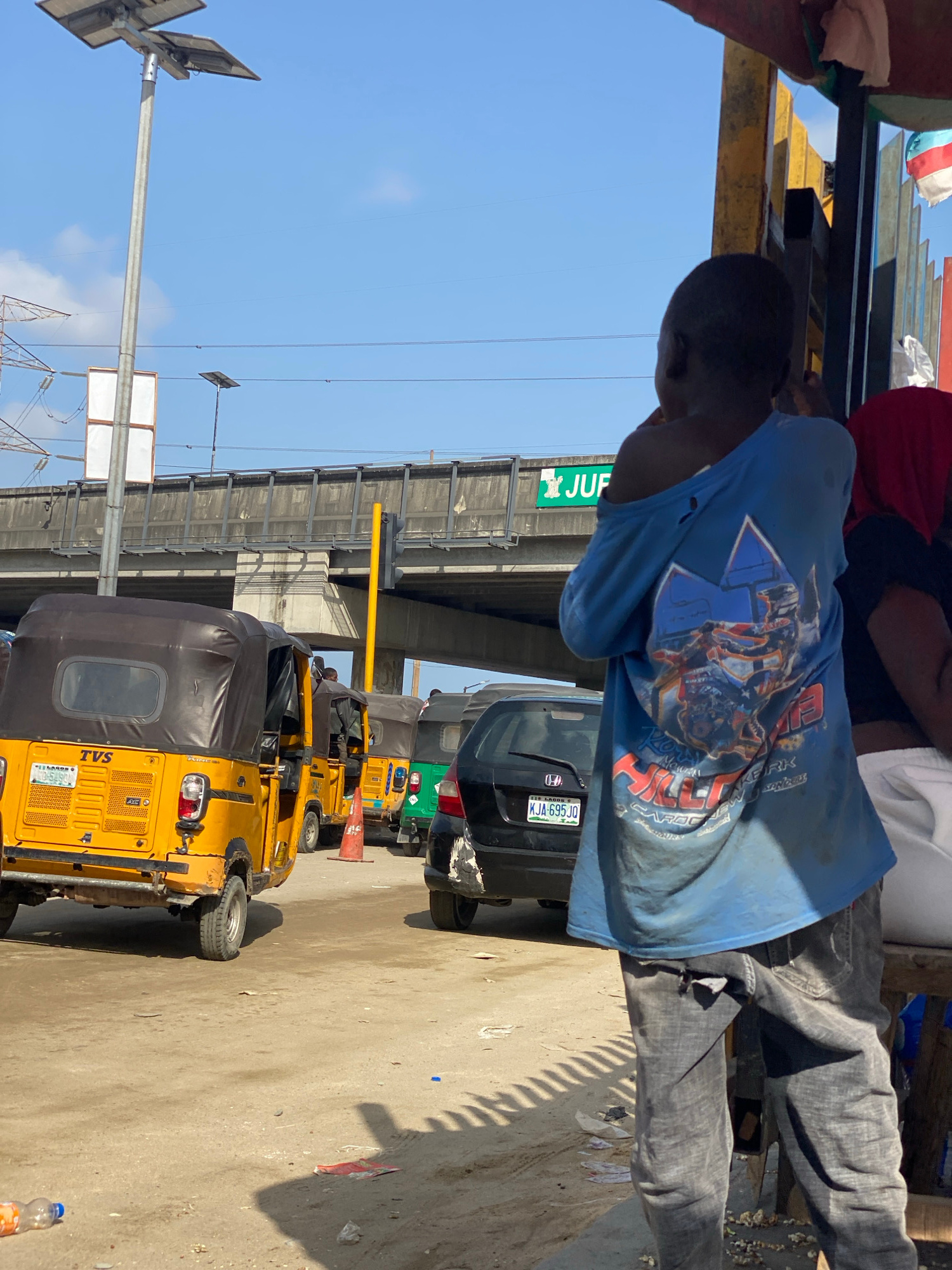 The image shows a street scene in Lagos, Nigeria. A person wearing a blue t-shirt with a graphic design and gray pants is standing to the side. In the street are several yellow three-wheeled vehicles…read more
