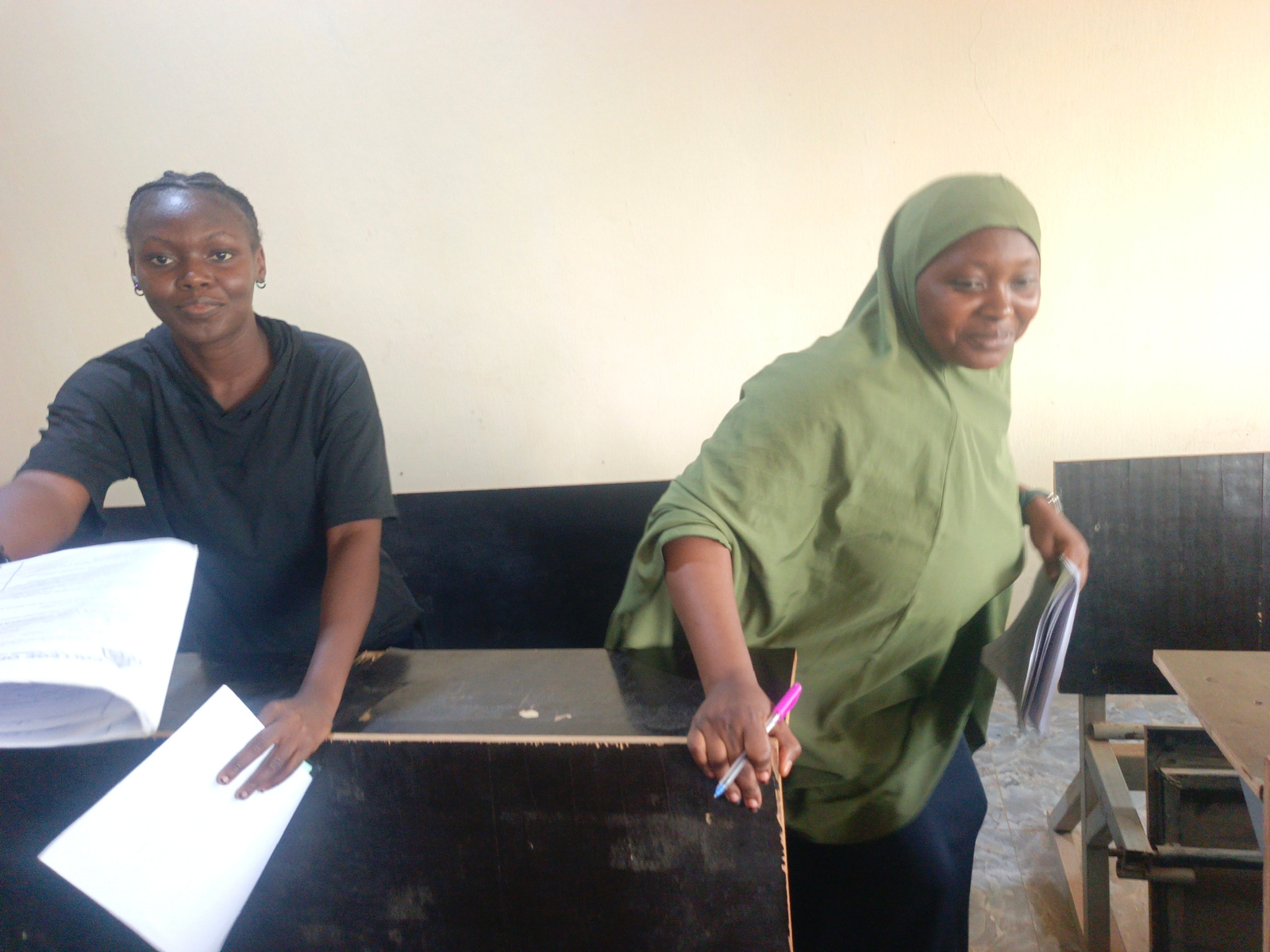 Two women are positioned behind a dark-colored desk. The woman on the left is wearing a black shirt and handling papers. The woman on the right wears a green hijab and holds a pen in her hand, also ho…read more