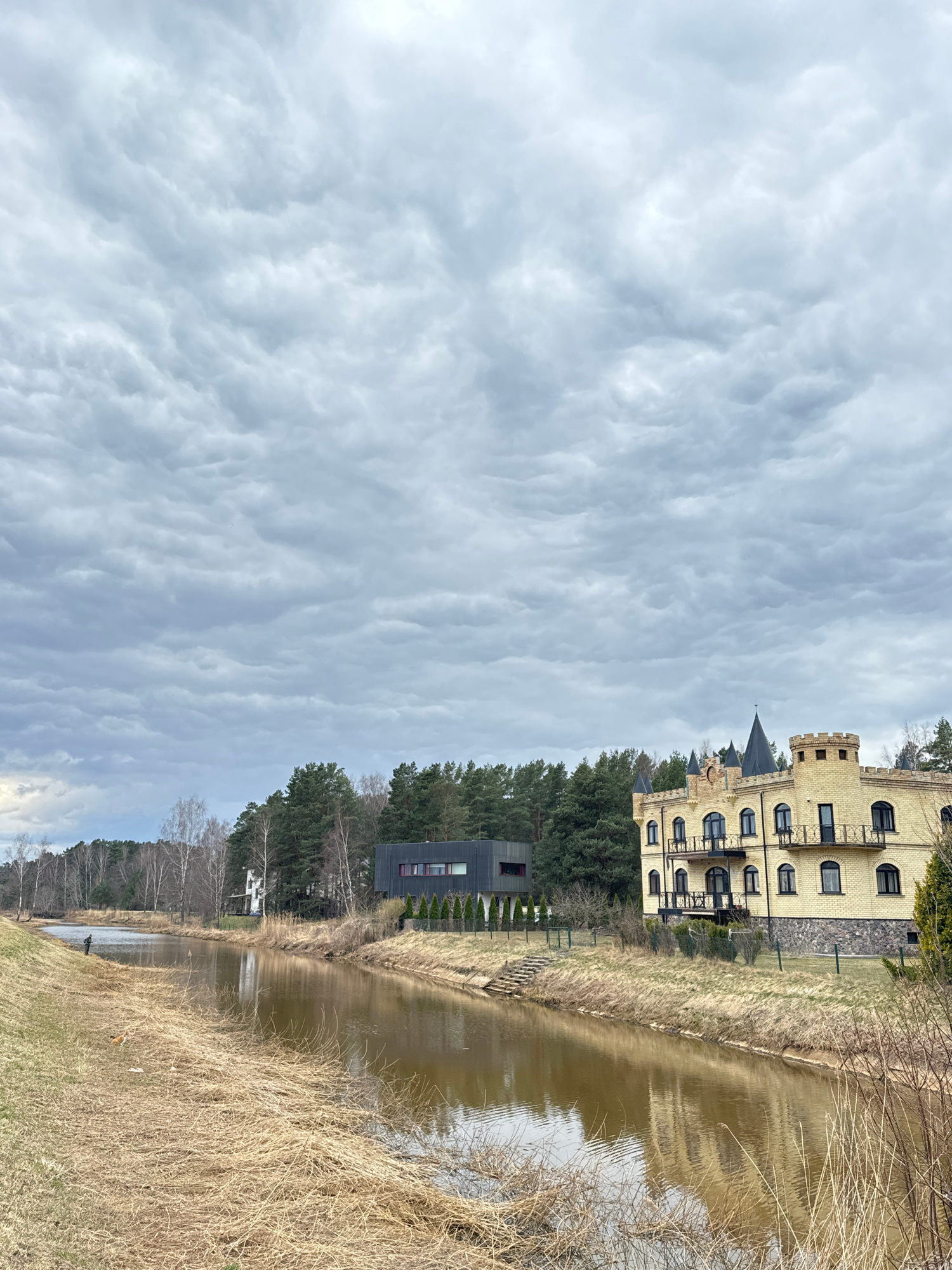 The image shows a view of a landscape featuring buildings and a body of water, likely a canal or narrow river. A yellow, castle-like building with multiple turrets and black-framed arched windows stan…read more