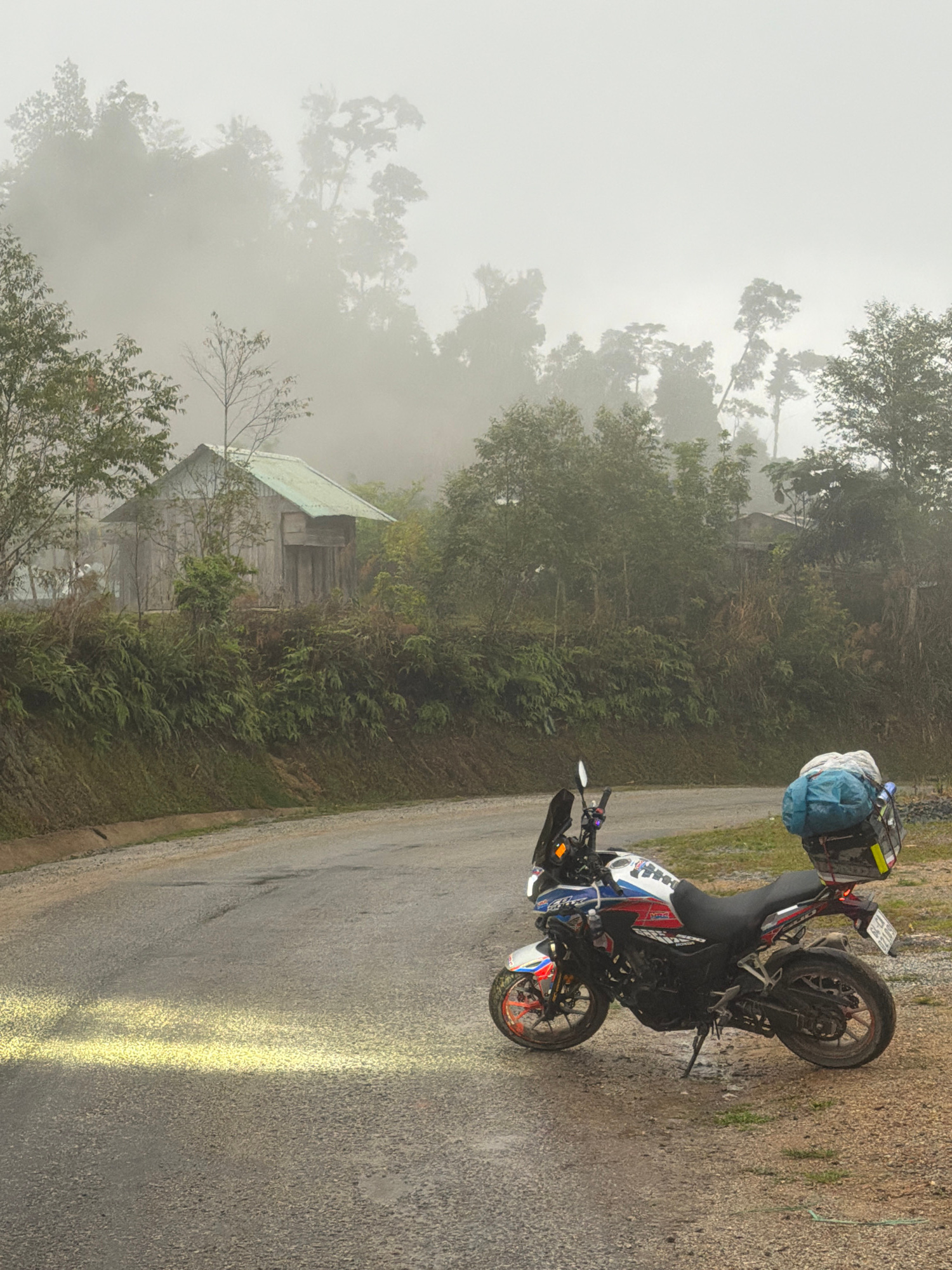 The image shows a motorcycle parked on a paved road alongside a hillside obscured by fog. The motorcycle is loaded with a blue duffel bag and a metal container, possibly for storage. The road surface…read more