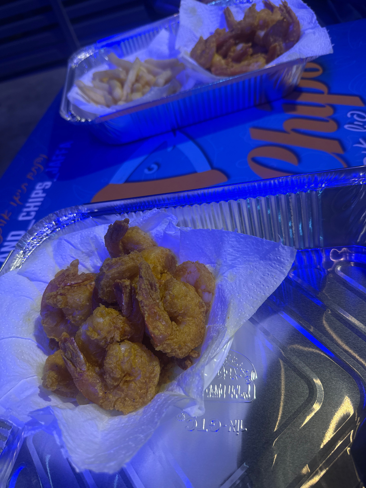 The image shows two takeout containers of food on a blue surface with the word "Jaffa" visible. The container on the right holds fried shrimp on a paper towel. The container on the left holds fried fo…read more