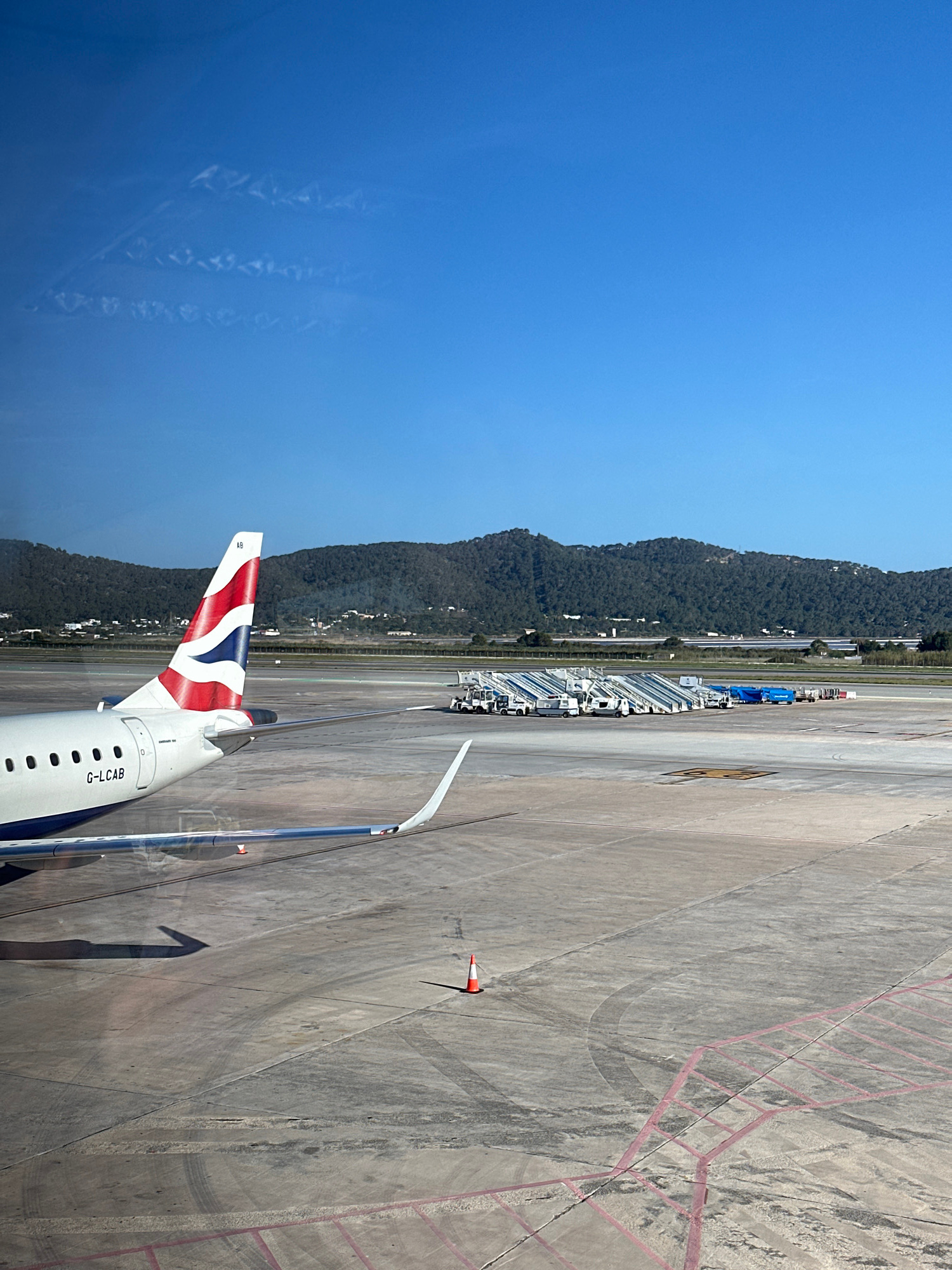 A British Airways aircraft, tail number G-LCAB, is positioned on the tarmac, likely at Ibiza Airport in Sant Josep de sa Talaia, Spain. The aircraft is viewed through a window. The plane's tail, adorn…read more