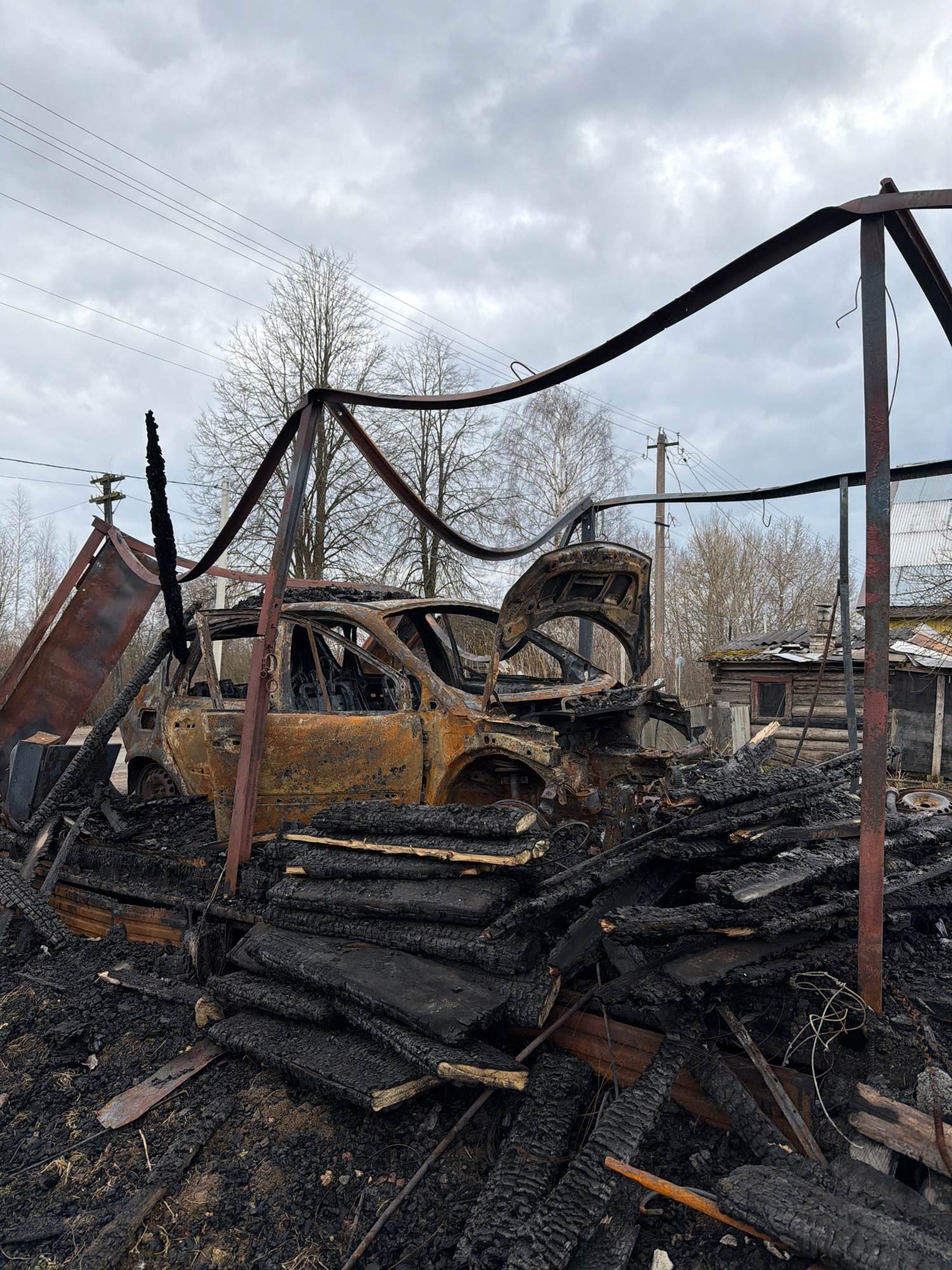 The image depicts a scene of significant destruction, likely caused by a fire. The primary subject is a burnt-out vehicle, reduced to its metal frame. Charred wooden debris is piled around the vehicle…read more