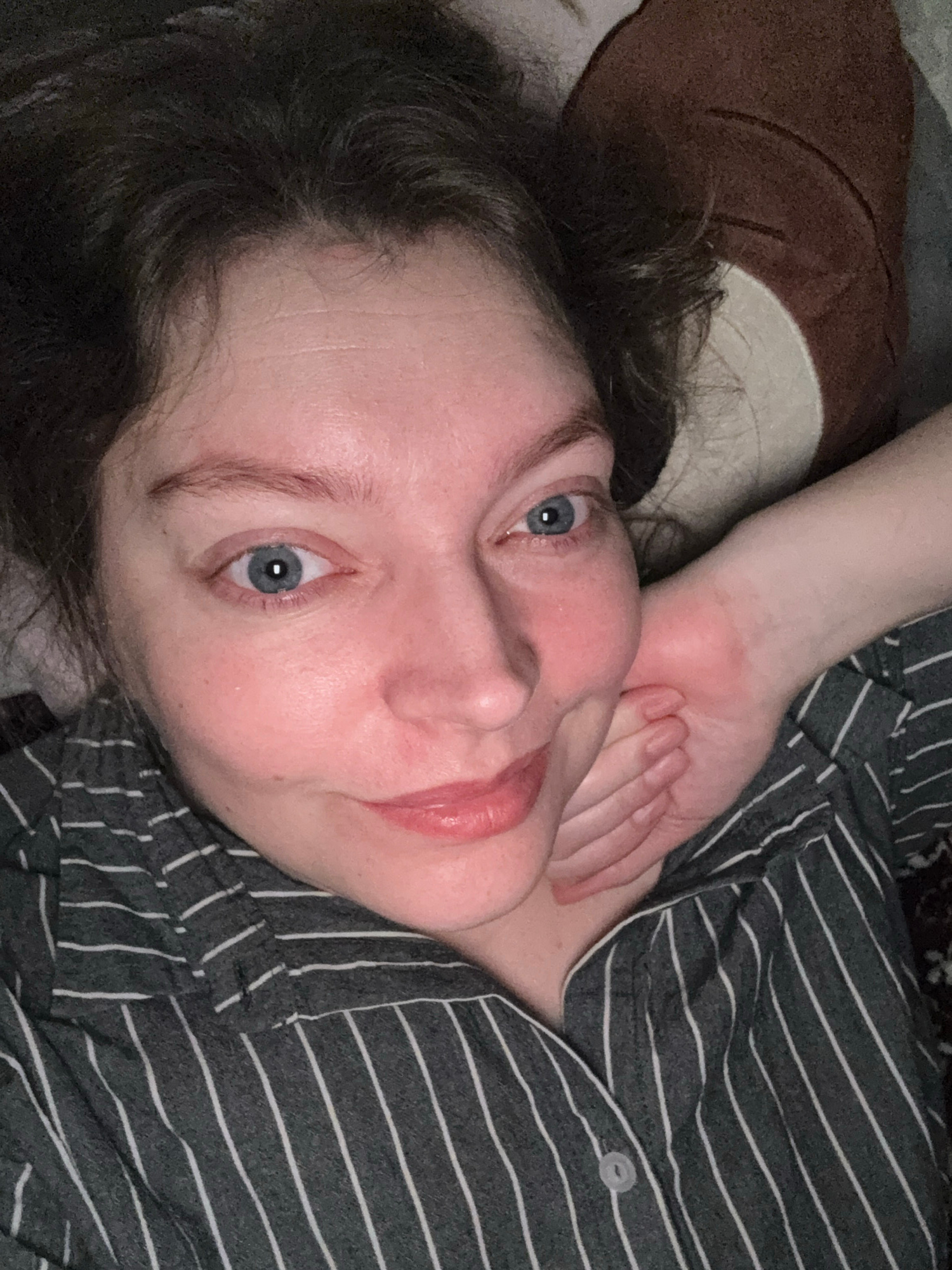 A close-up, angled view shows a person lying down, seemingly indoors. The person has fair skin, light eyes, and dark hair. They are wearing a grey and white striped collared shirt with a visible butto…read more