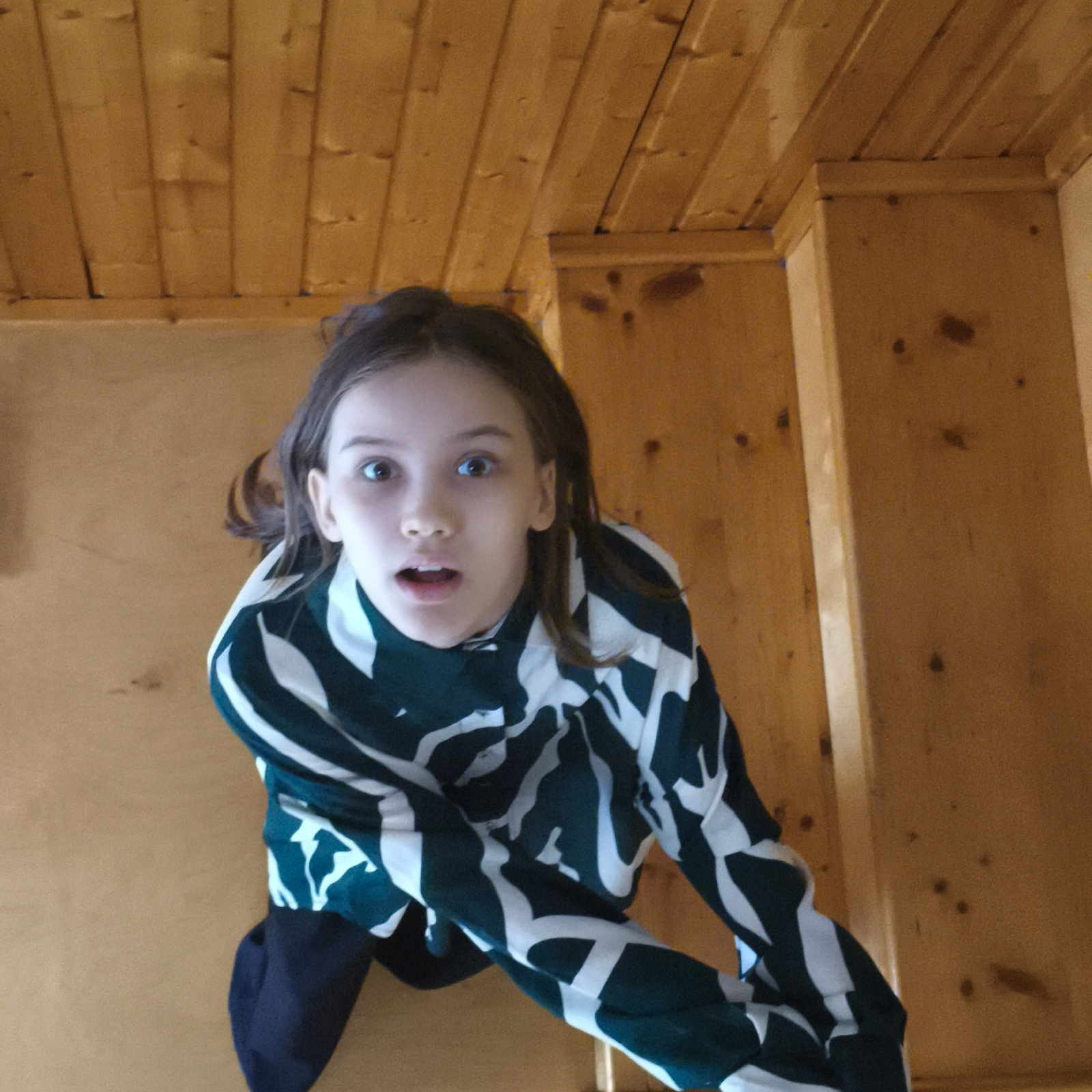 A young girl with brown hair and fair skin looks upward with a surprised expression. She is wearing a long-sleeved shirt with a green and white zebra-like pattern and dark leggings. The setting appear…read more