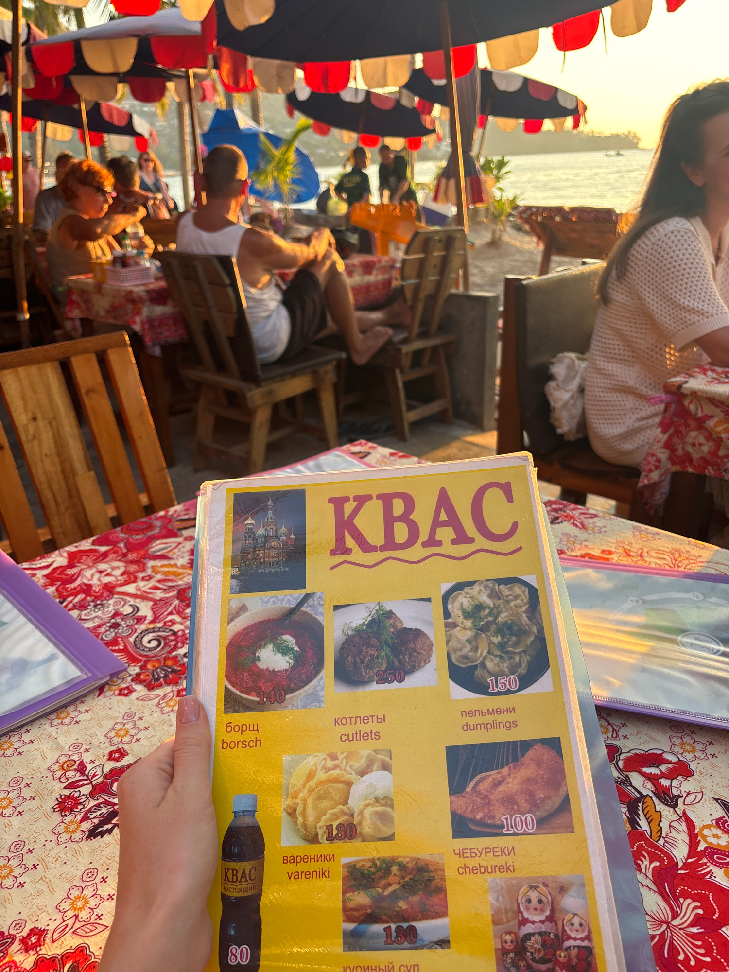 Here is a description of the image: The image shows an outdoor dining scene, seemingly in Kamala, Thailand, though not explicitly stated. Several people are seated and interacting at tables in what l…read more