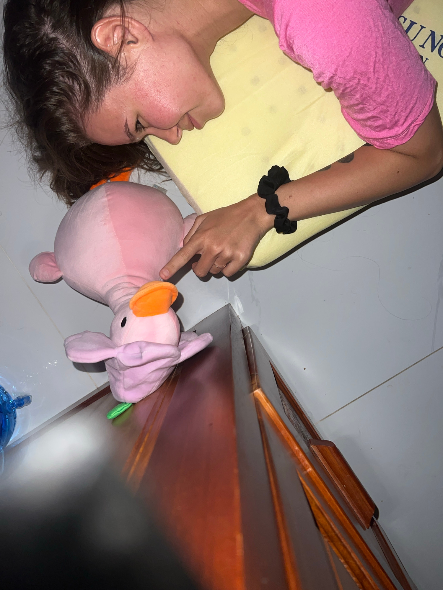 A woman lies on a yellow pillow next to a wooden dresser, pointing at a pink elephant stuffed animal. The scene is set on a tile floor, possibly in a room near the Nam Natural Heritage Area Trang, Vie…read more