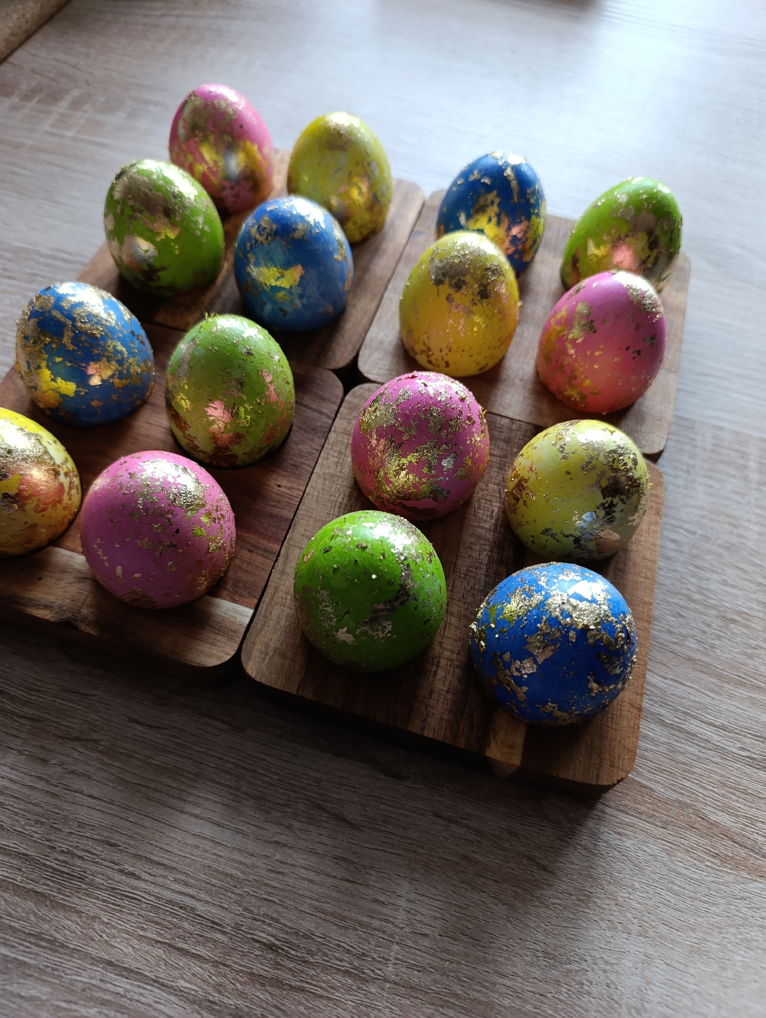 The image shows sixteen Easter eggs arranged on four small wooden serving boards. The eggs are painted in various colors including pink, yellow, blue, and green, and are decorated with gold leaf. The…read more
