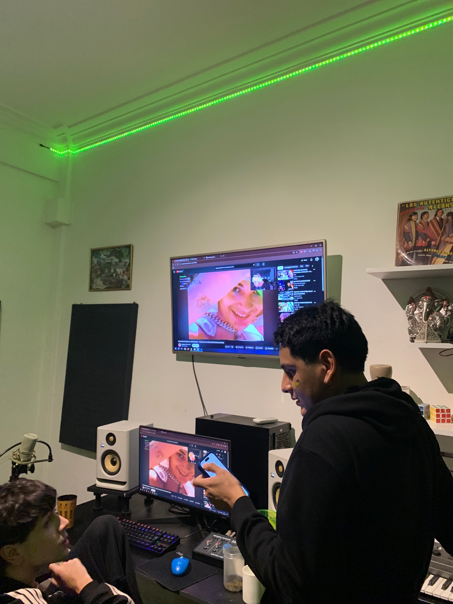 Two individuals are present in what appears to be a recording studio or music production workspace. One person, wearing a black hoodie, is standing and interacting with a computer monitor. Their hand…read more