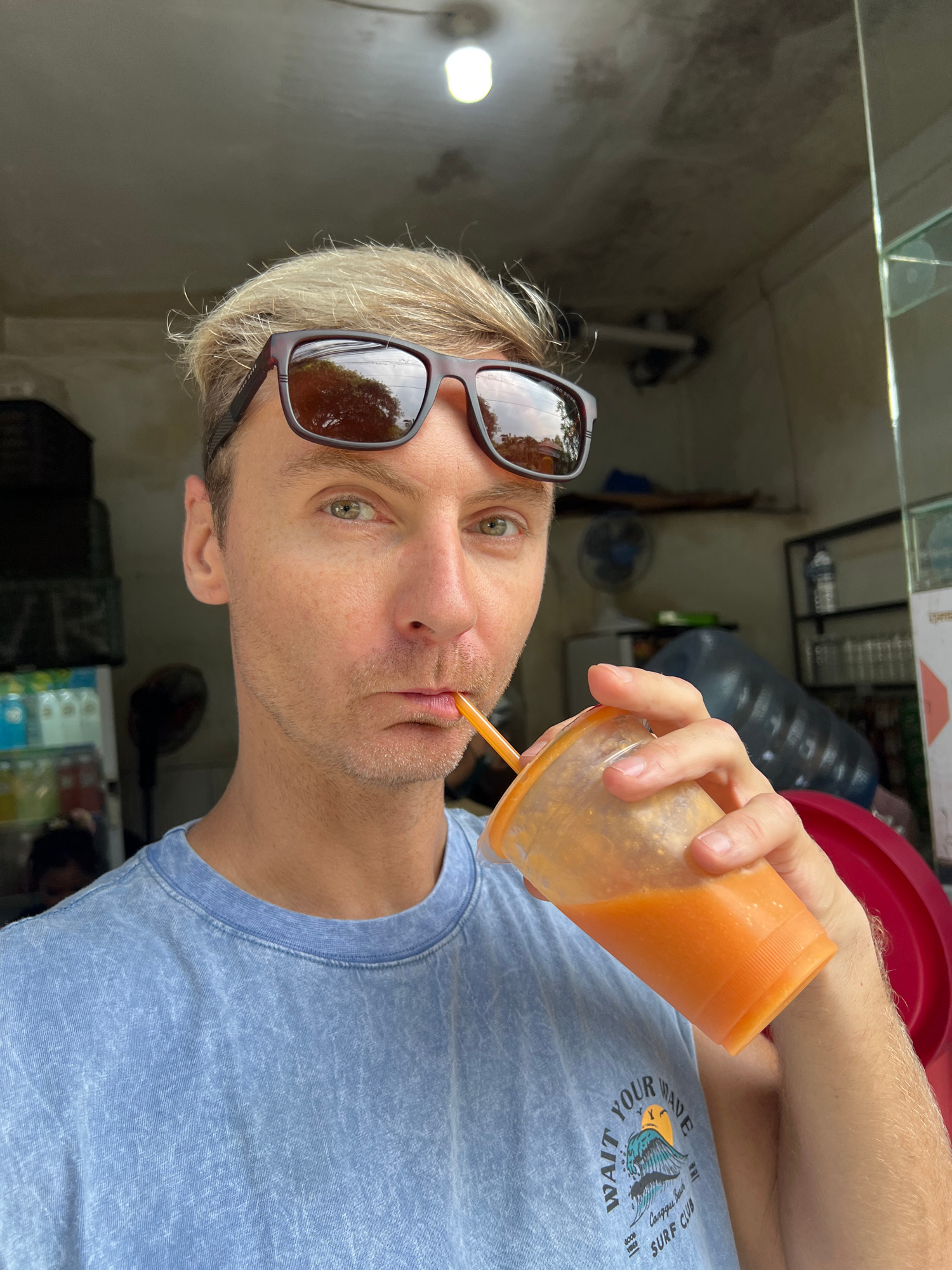 A fair-skinned man with blond hair, stubble, and sunglasses is drinking from an orange plastic cup with a straw. He is wearing a blue t-shirt with a graphic design on it. The background is a partially…read more