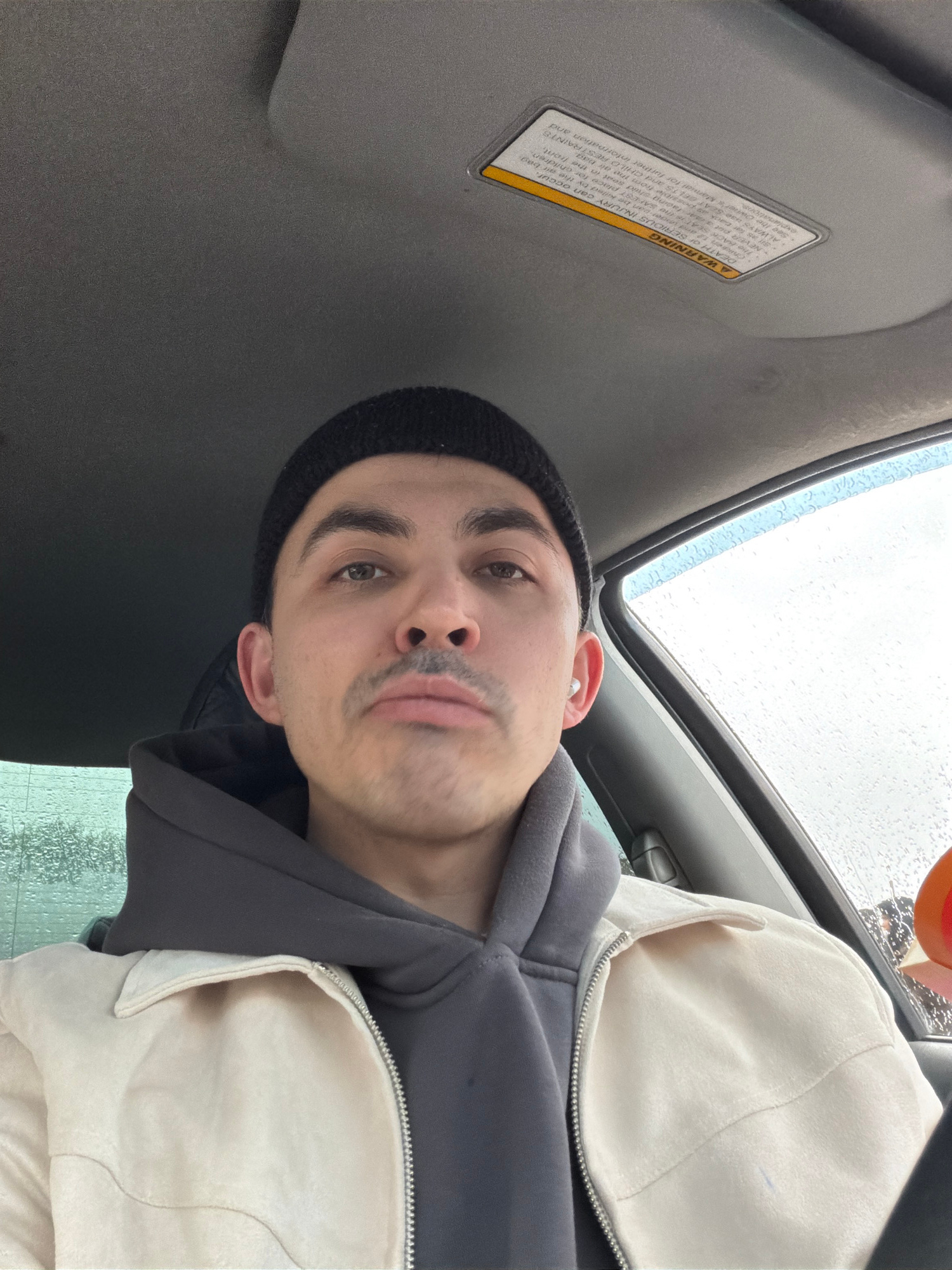 A close-up, slightly angled, selfie of a young adult man, positioned inside a vehicle, possibly a car, looking directly at the camera. He is wearing a dark-colored beanie, a grey hooded sweatshirt, an…read more