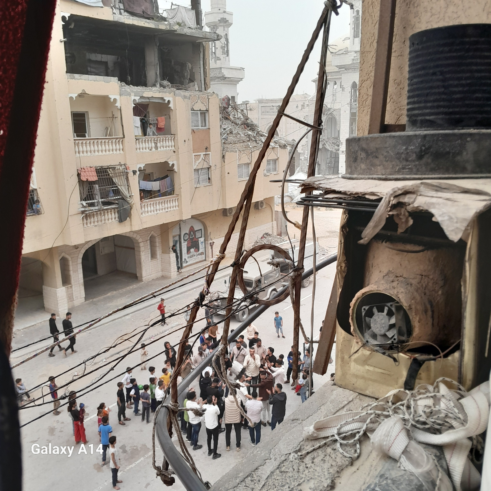 The image, taken from a high vantage point looking down, depicts a scene of communal activity amidst significant urban destruction in Khan Yunis, Palestinian Territory. In the foreground, a dark, cor…read more