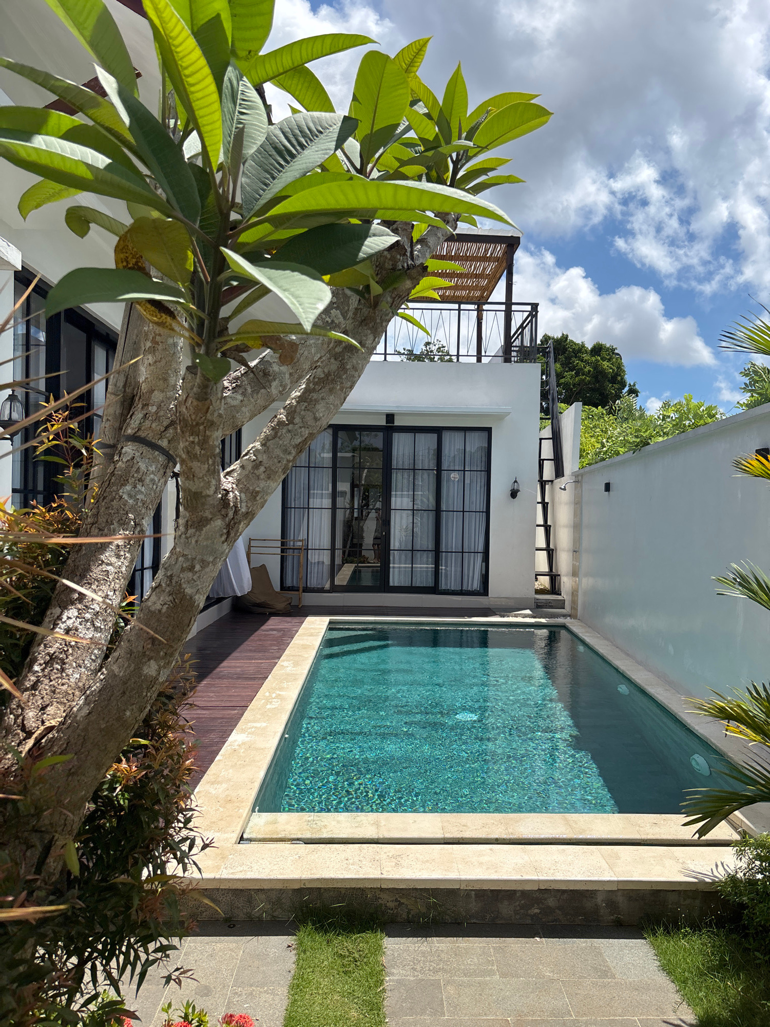The image shows a building with a pool in Ungasan, Indonesia. A plumeria tree with large green leaves dominates the foreground, partially obscuring the view of the building. The building features a wh…read more