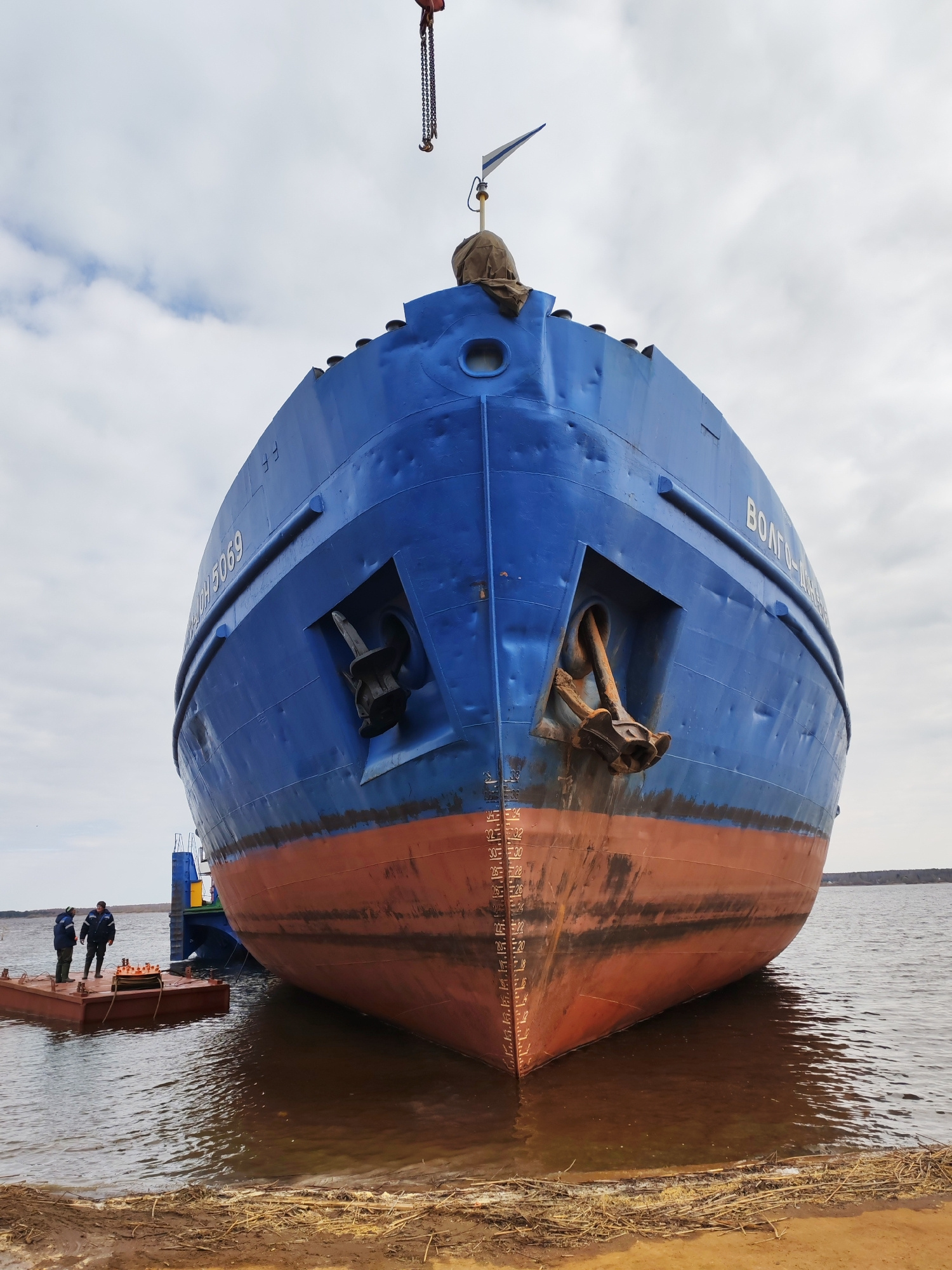 A large cargo ship, painted blue above the waterline and red below, is prominently featured from a head-on perspective, partially out of the water on a muddy bank. Its V-shaped bow points towards the…read more
