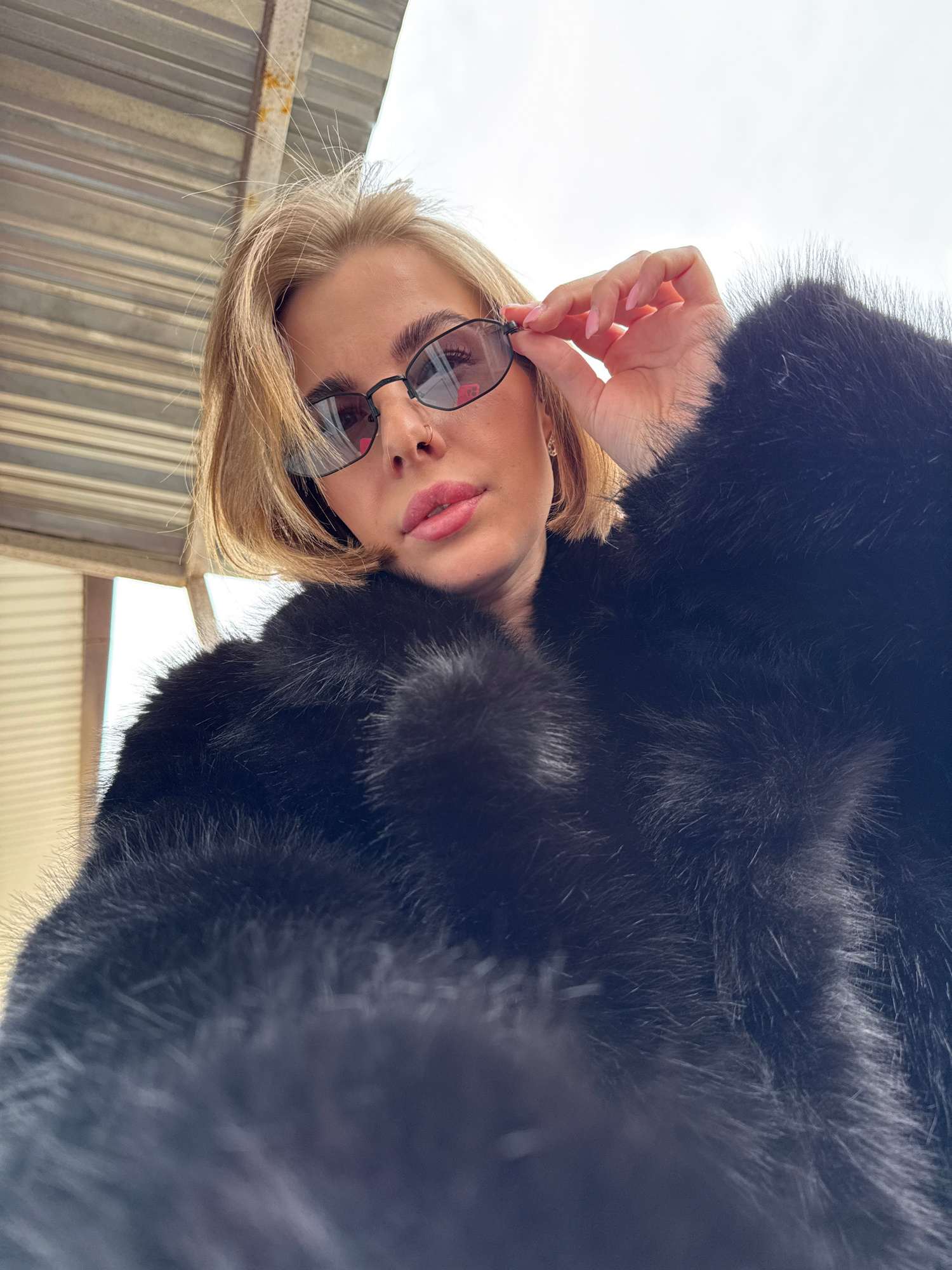 A woman with blonde hair and sunglasses is looking down at the camera, wearing a black fur coat. Her left hand is adjusting the sunglasses on her face. The background is blurry, showing a metal struct…read more