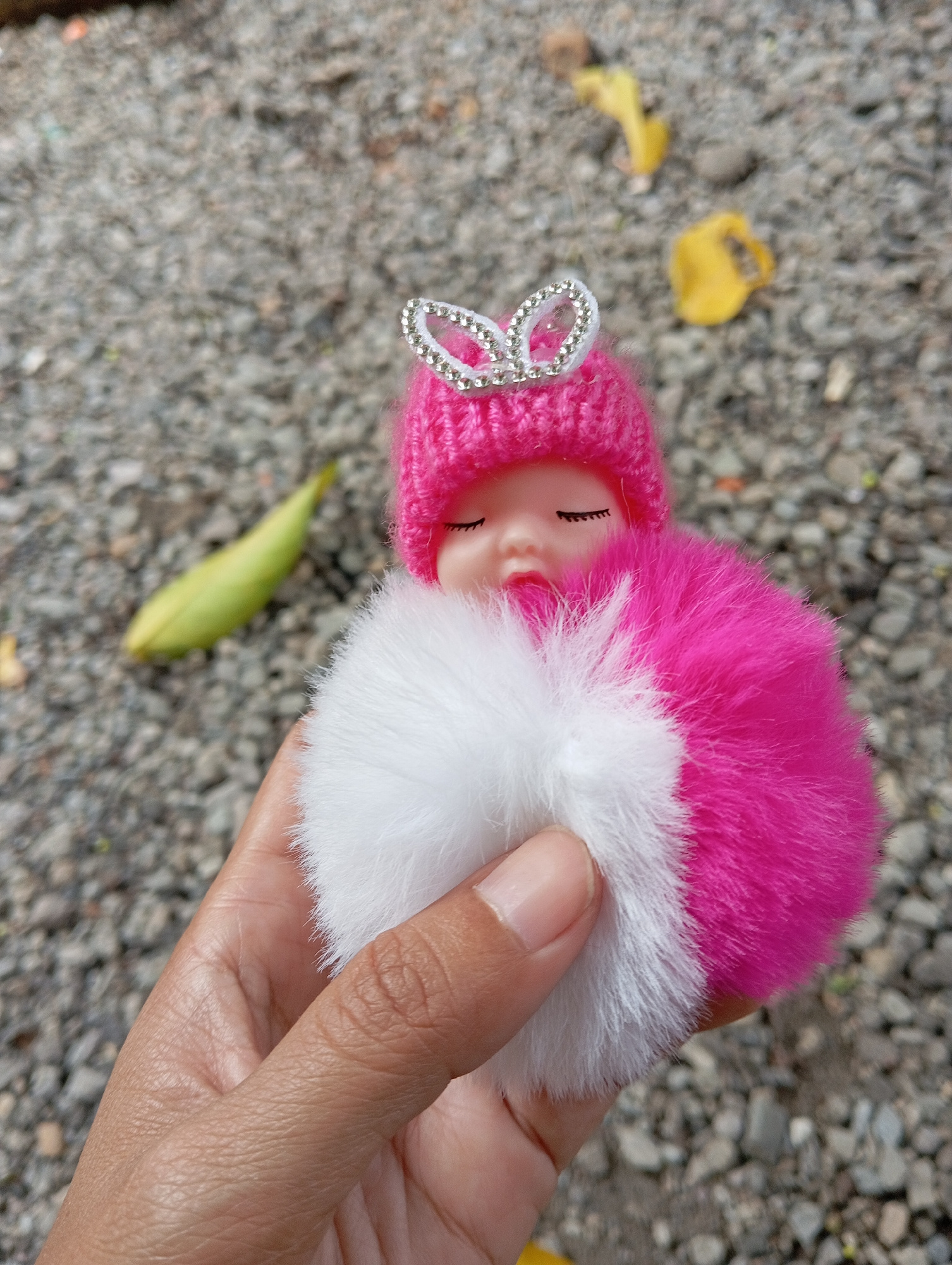 A hand holds a doll-like object. The doll features a pink knit cap adorned with a silver butterfly ornament, and a round pink and white fluffy body. The background is a surface of small stones and sca…read more