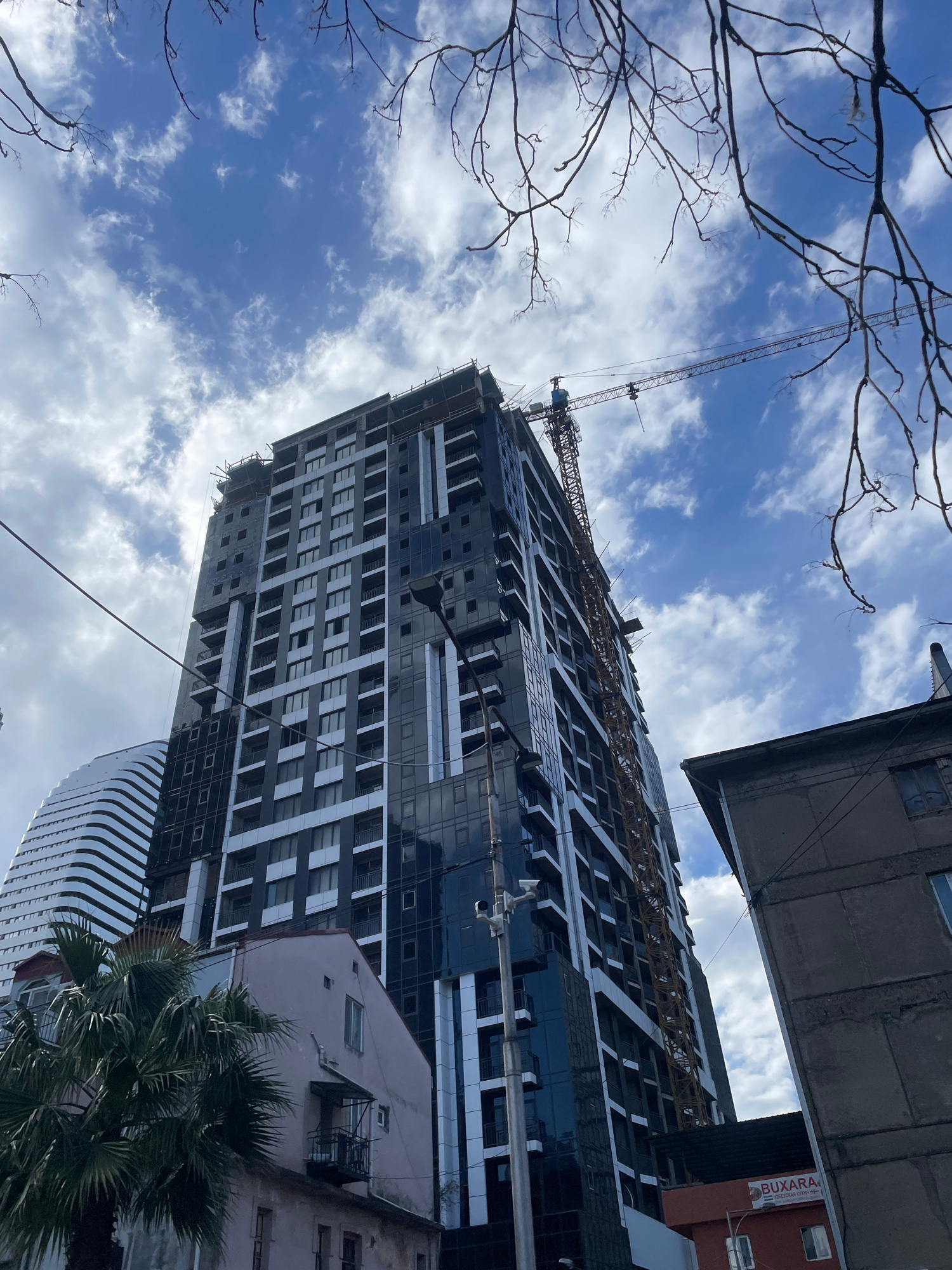 The image shows a tall, modern building under construction in Batumi, Georgia. The building has a predominantly dark facade with white horizontal elements and numerous windows. A construction crane is…read more