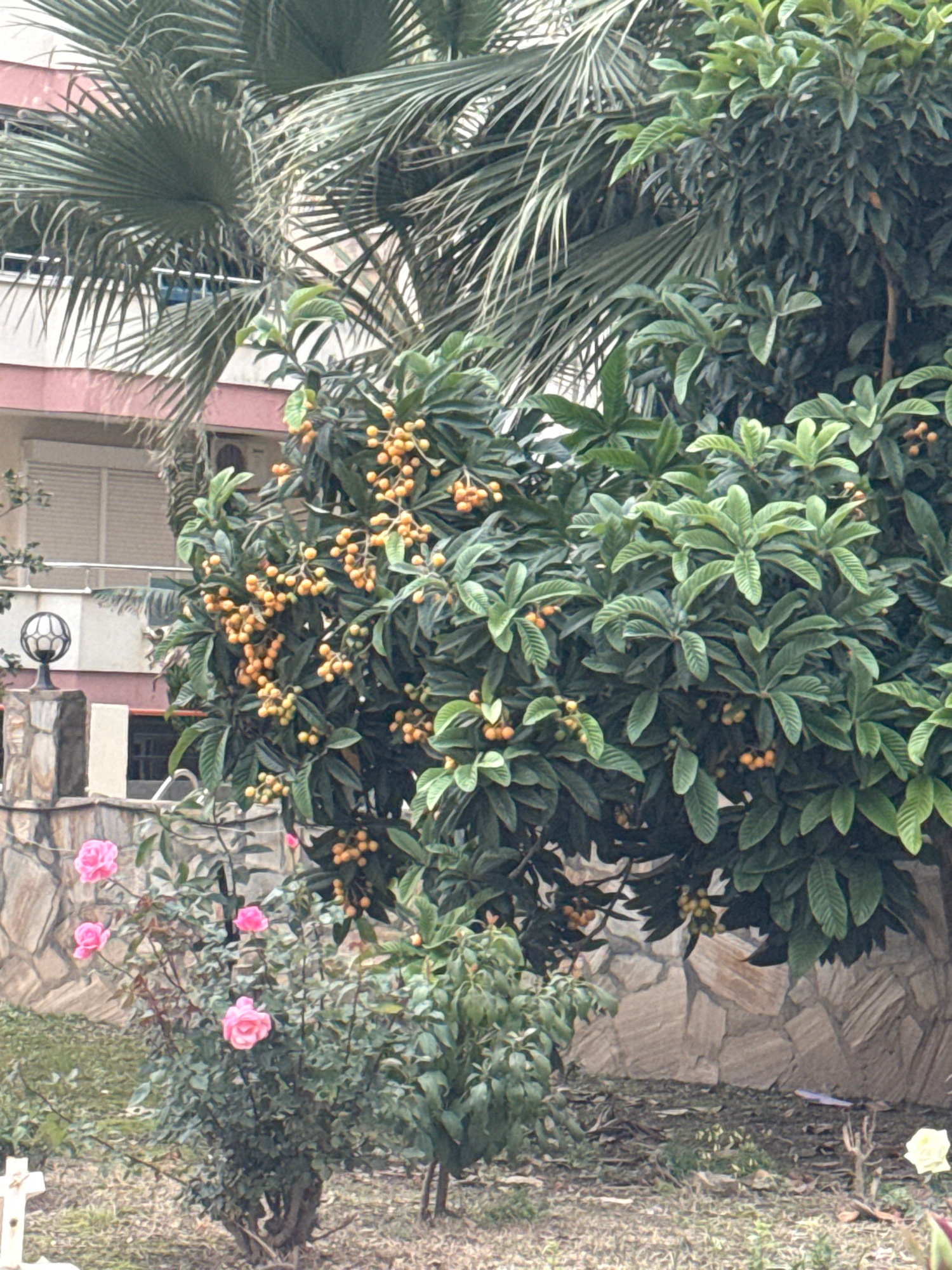 The image shows a garden in an urban environment. In the foreground, there is a tree with green leaves and small, round, orange fruits. Adjacent to this tree is a rose bush with pink flowers. Behind t…read more