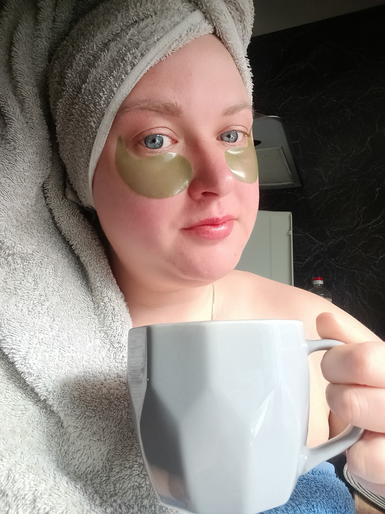 A fair-skinned woman with blue eyes is holding a gray mug and wearing green under-eye patches. She has a gray towel wrapped around her head. The background includes a black marble-patterned wall, a wh…read more