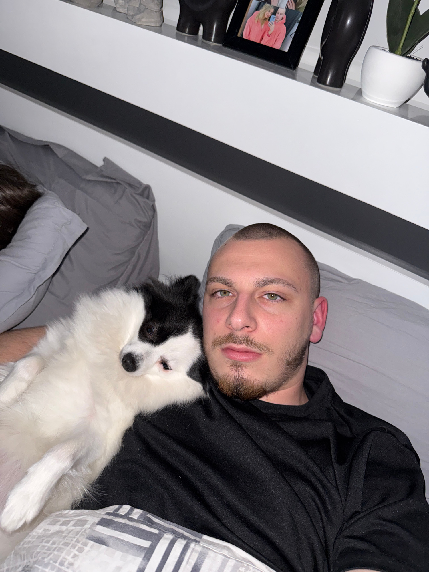A man with short hair and a beard is lying in a bed, resting his head near a white and black dog. The man is wearing a black shirt. The dog is predominantly white with black patches around its eye andβ¦read more