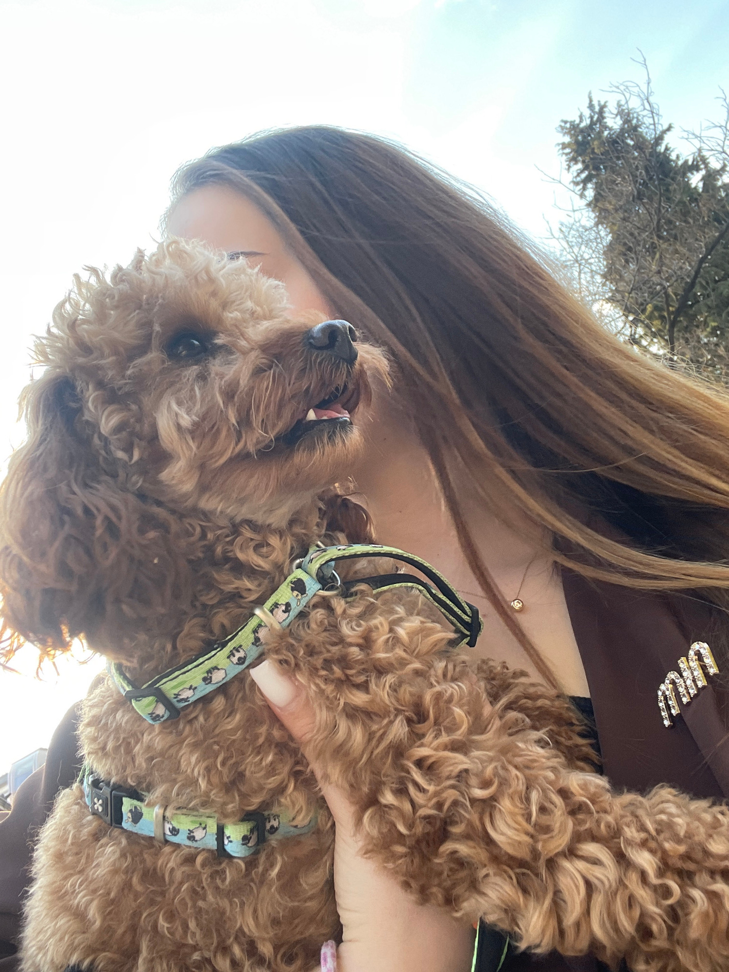 A woman is holding a brown poodle outdoors. The dog is wearing a green harness with sheep images on it. The woman has long brown hair and is wearing a brown jacket with a gold pin. The location is not…read more