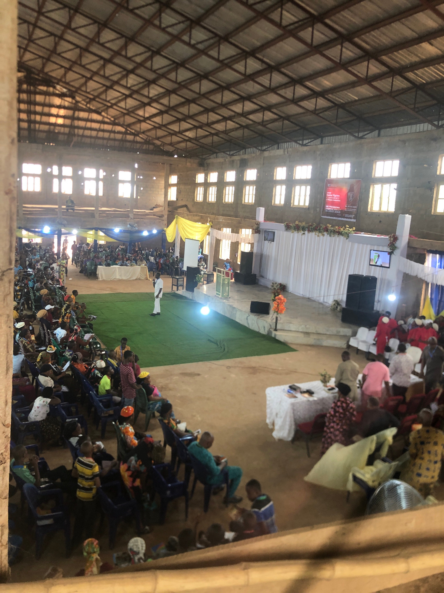 A large gathering of people is situated within what appears to be a church or auditorium. The location is Obosi, Nigeria. The building has a high ceiling with exposed beams and numerous windows that l…read more