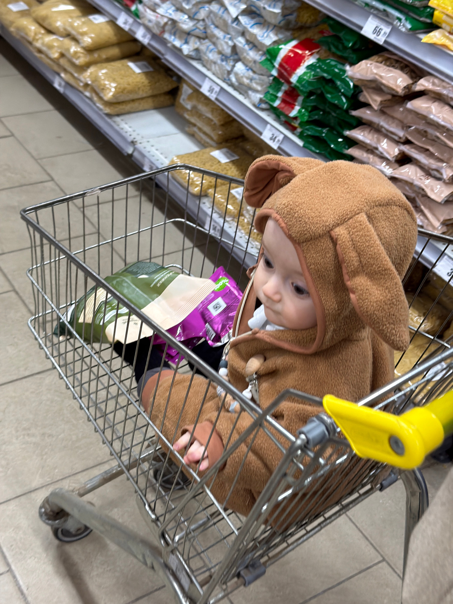 A high-angle shot inside what appears to be a grocery store in Saint Petersburg, Russia, features a baby in a brown, hooded, bunny-eared jacket sitting in a shopping cart. The baby is looking down and…read more