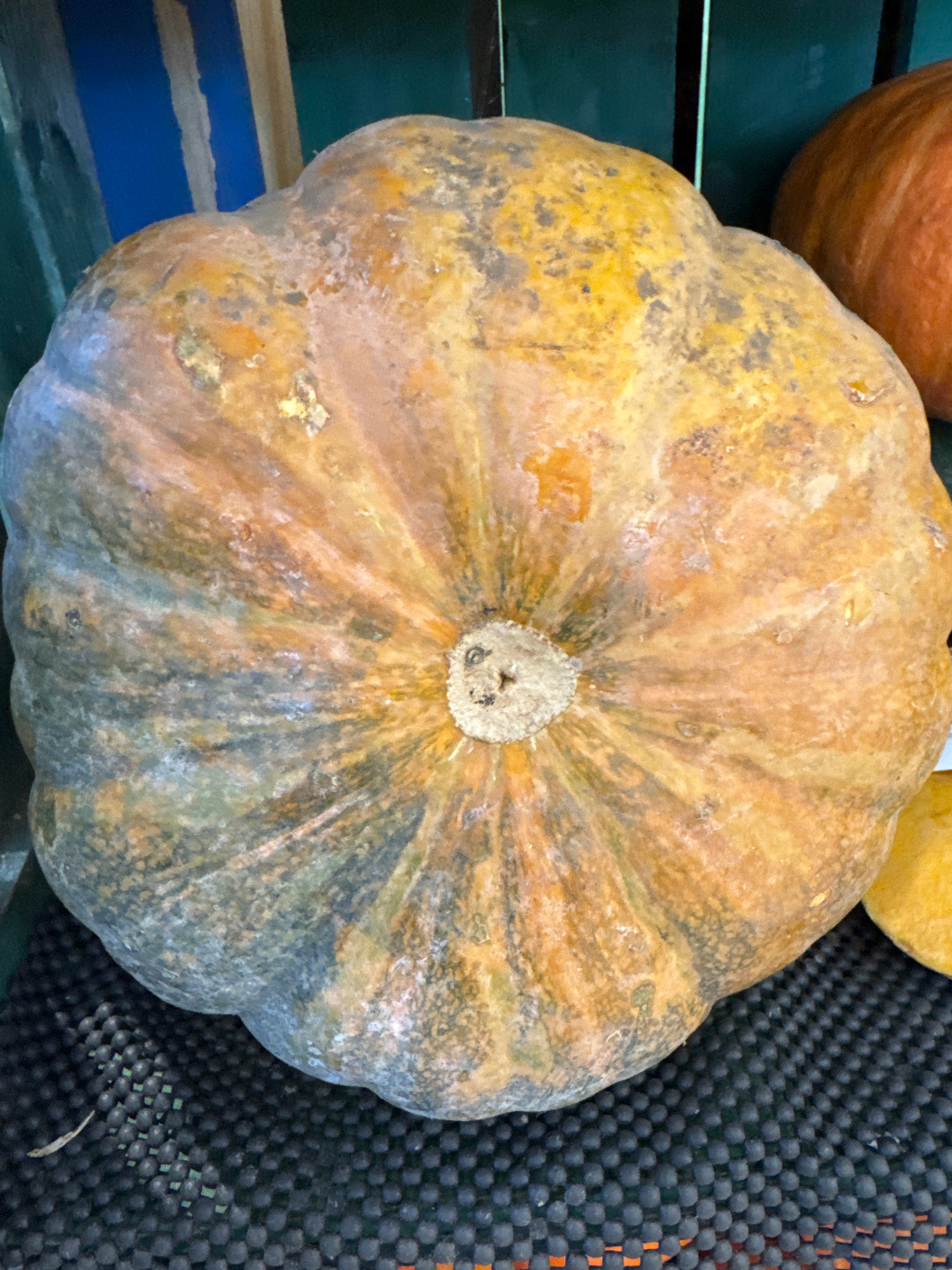 The image shows a large, round pumpkin from an overhead perspective. The pumpkin is primarily yellow-orange with areas of greenish-gray discoloration. The stem is visible at the center top. The pumpki…read more