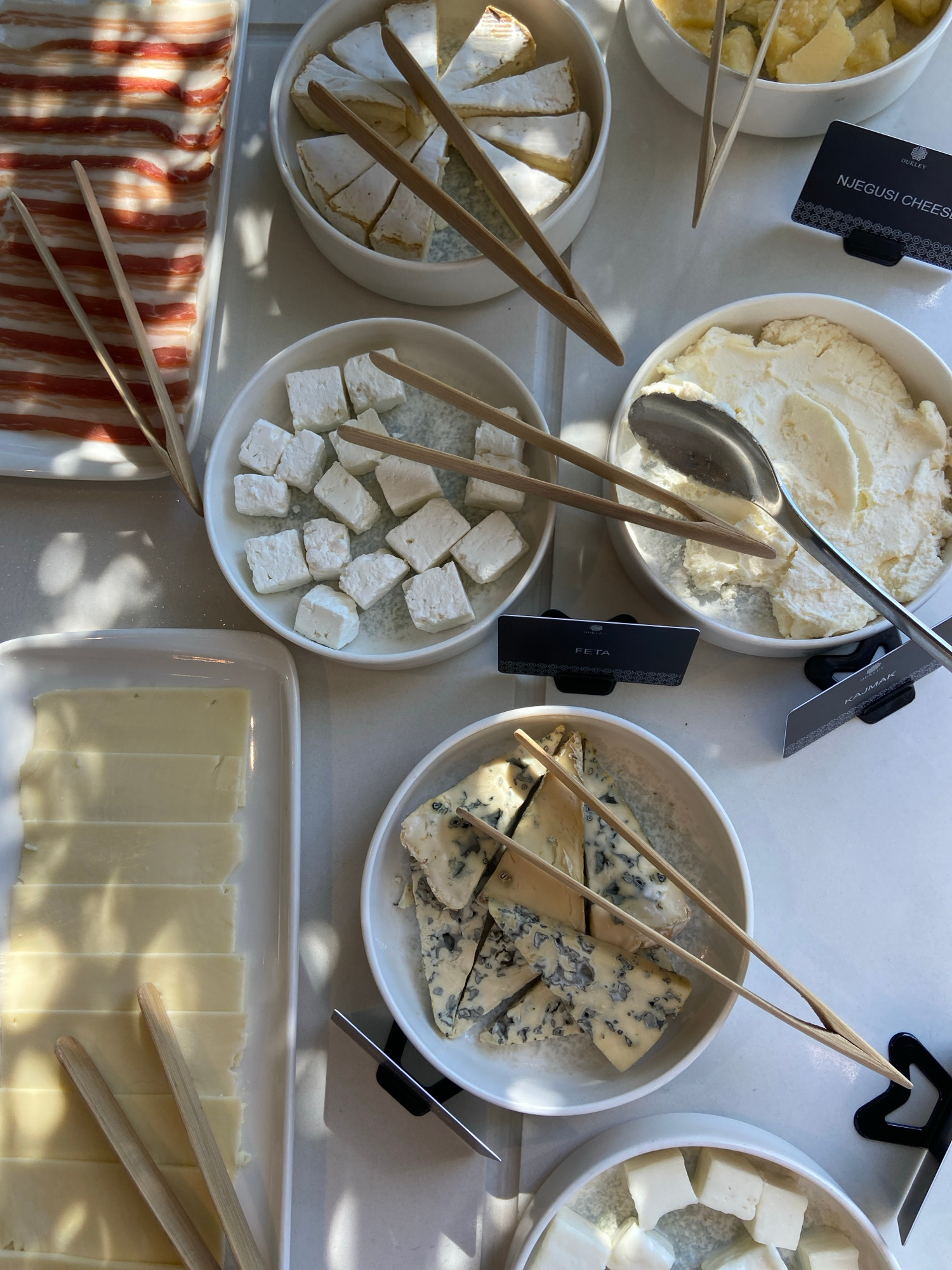 A high-angle shot depicts a cheese and meat buffet, seemingly indoors under bright natural light. The various cheeses are presented in white bowls and trays. From left to right: a bowl of sliced yello…read more