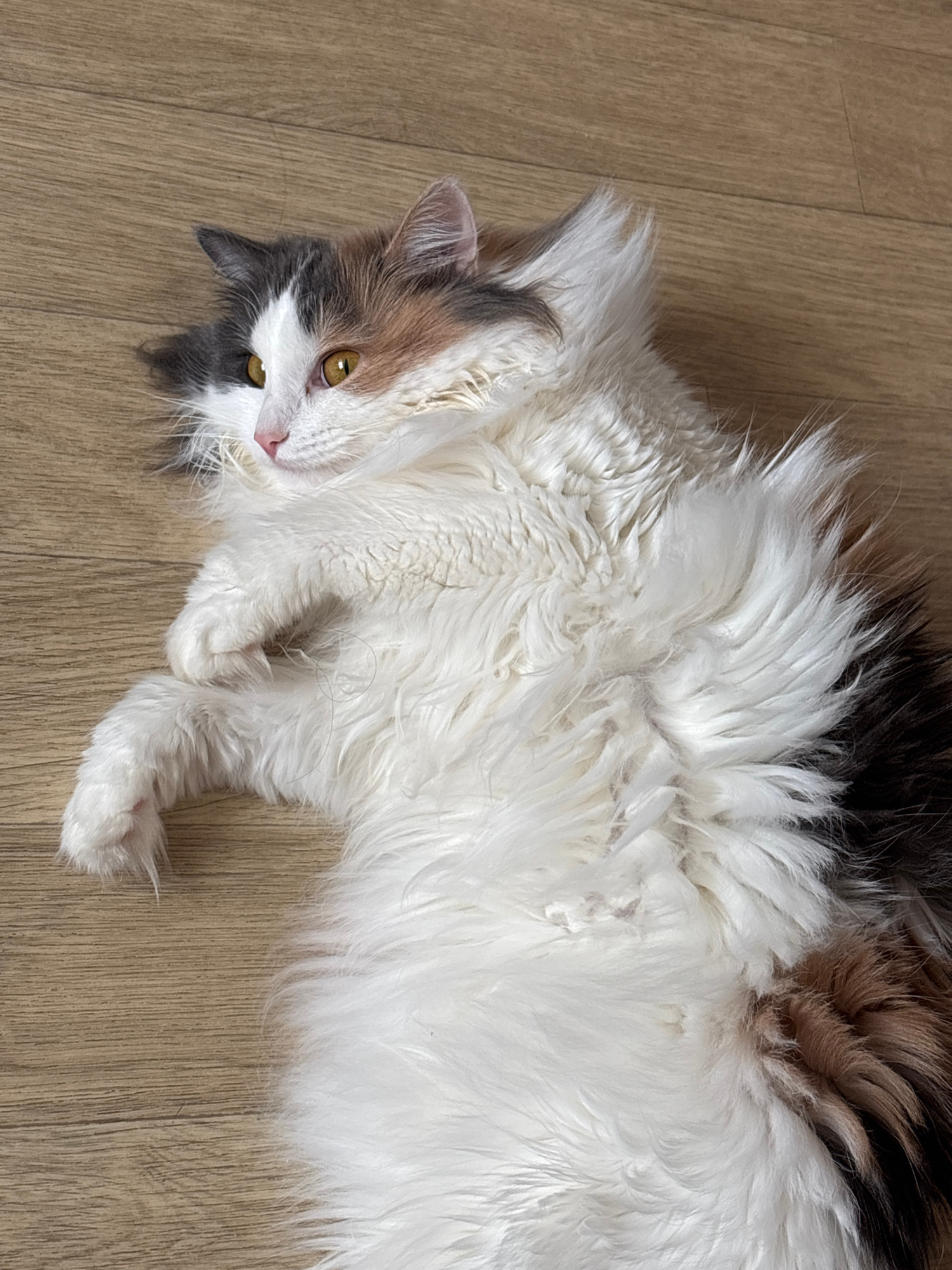 A long-haired calico cat is lying on its back on a light-colored wooden floor. The cat is looking up with golden eyes. Its paws are curled near its chest. The environment suggests an indoor space, lik…read more