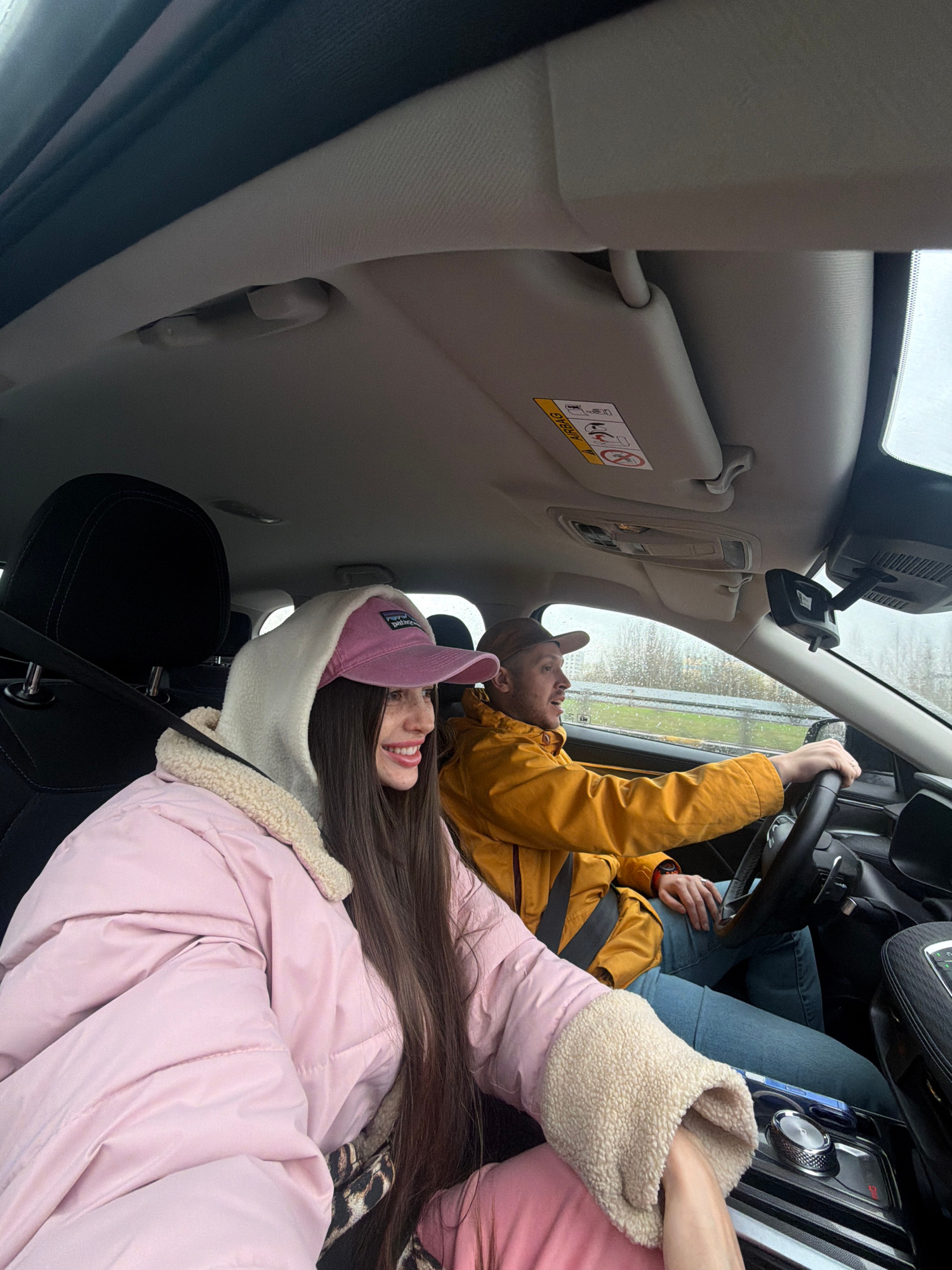 The interior of a car is depicted, with a man driving and a woman in the passenger seat. The man is wearing a yellow jacket and a brown hat, gripping the steering wheel. The woman is wearing a pink ja…read more