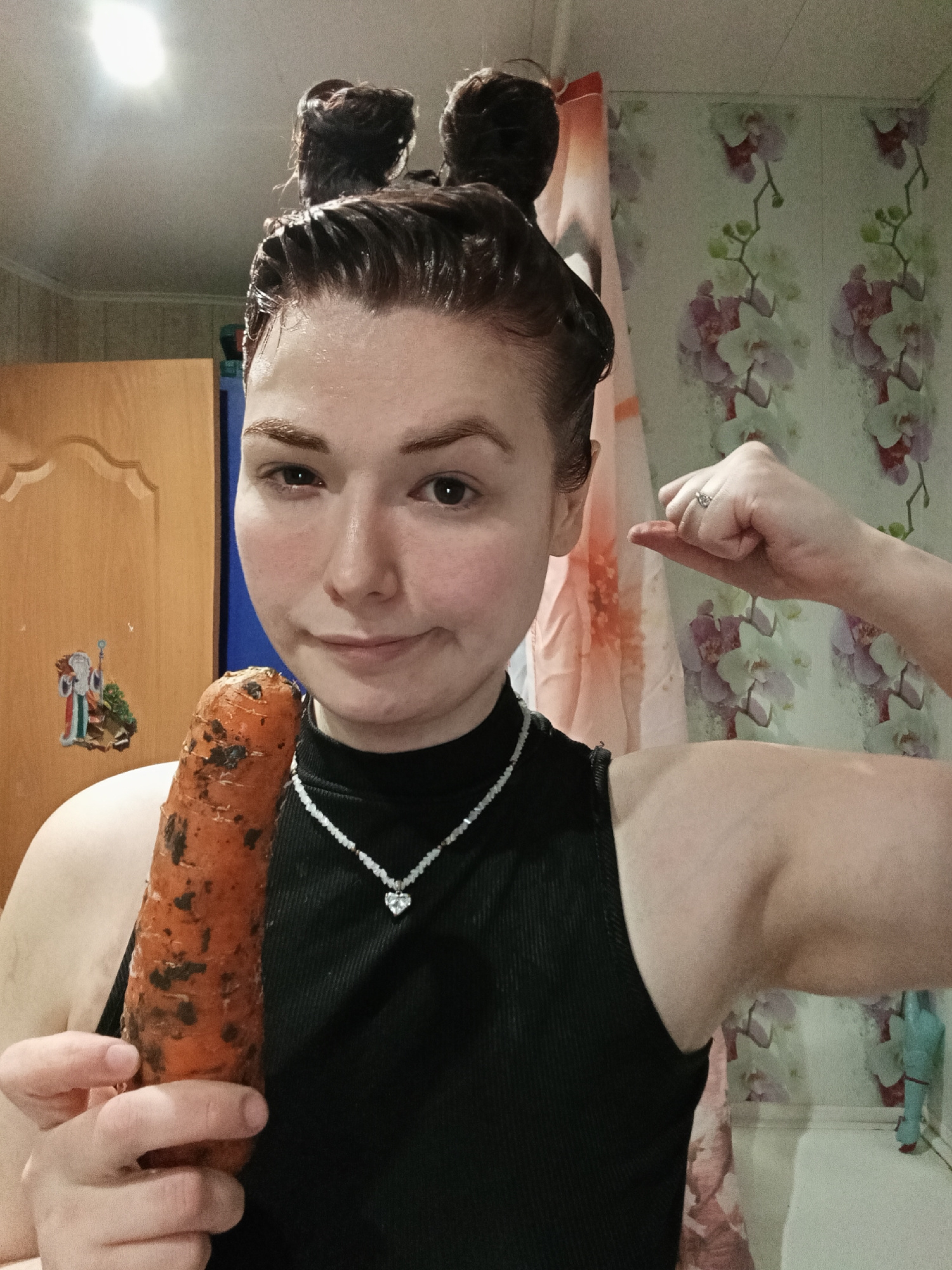 A woman with dark, wet hair styled in two buns on top of her head, wearing a black sleeveless top and a necklace with a heart-shaped pendant, is posing indoors. She is holding a large, dirty carrot inβ¦read more